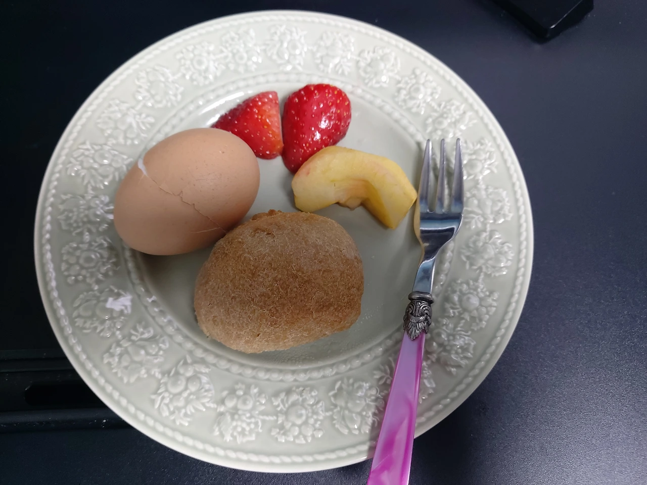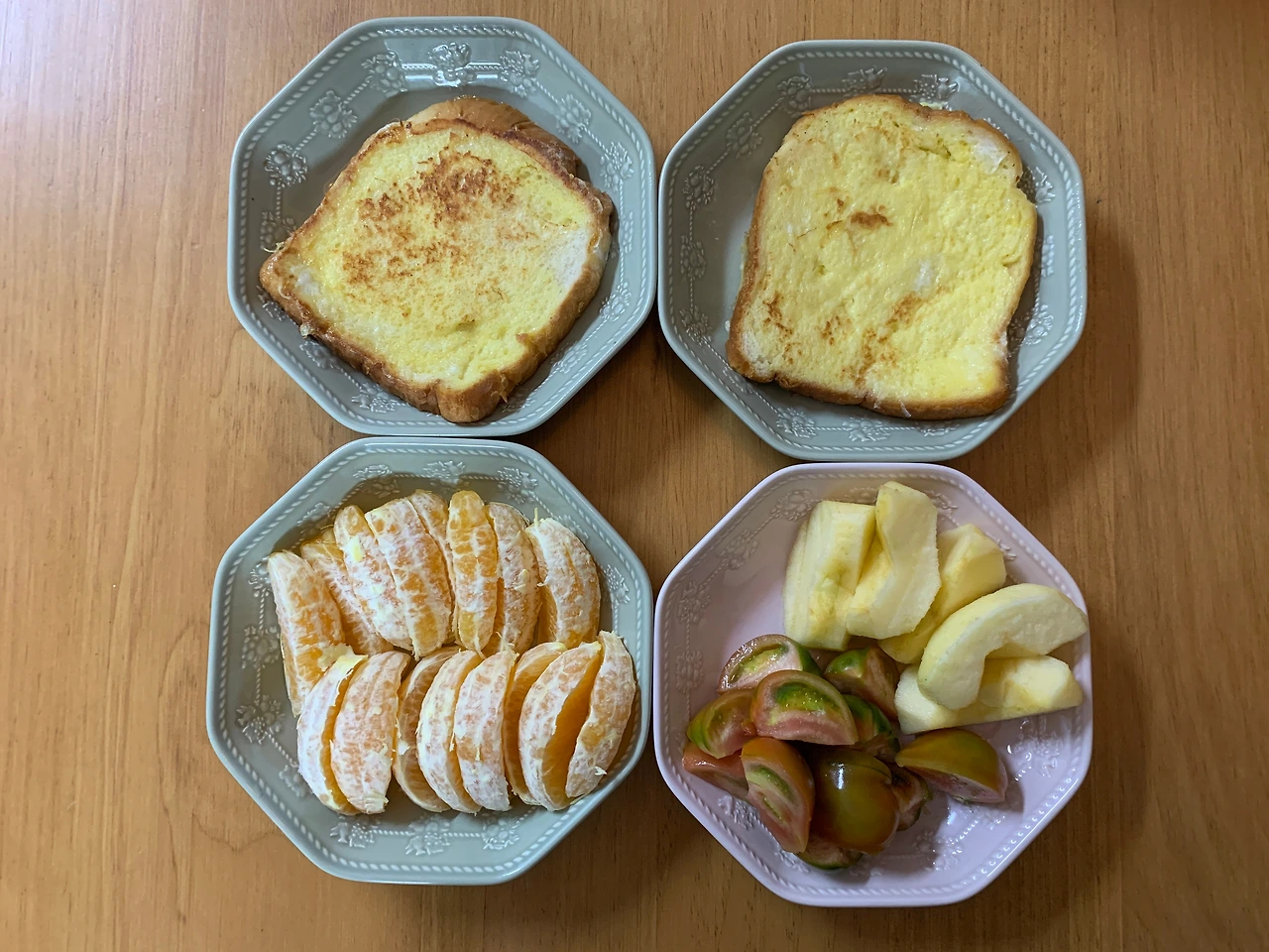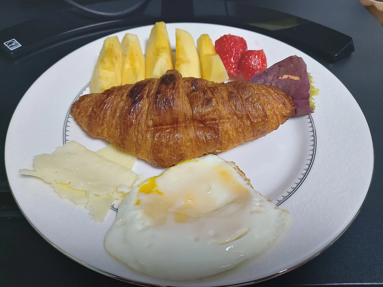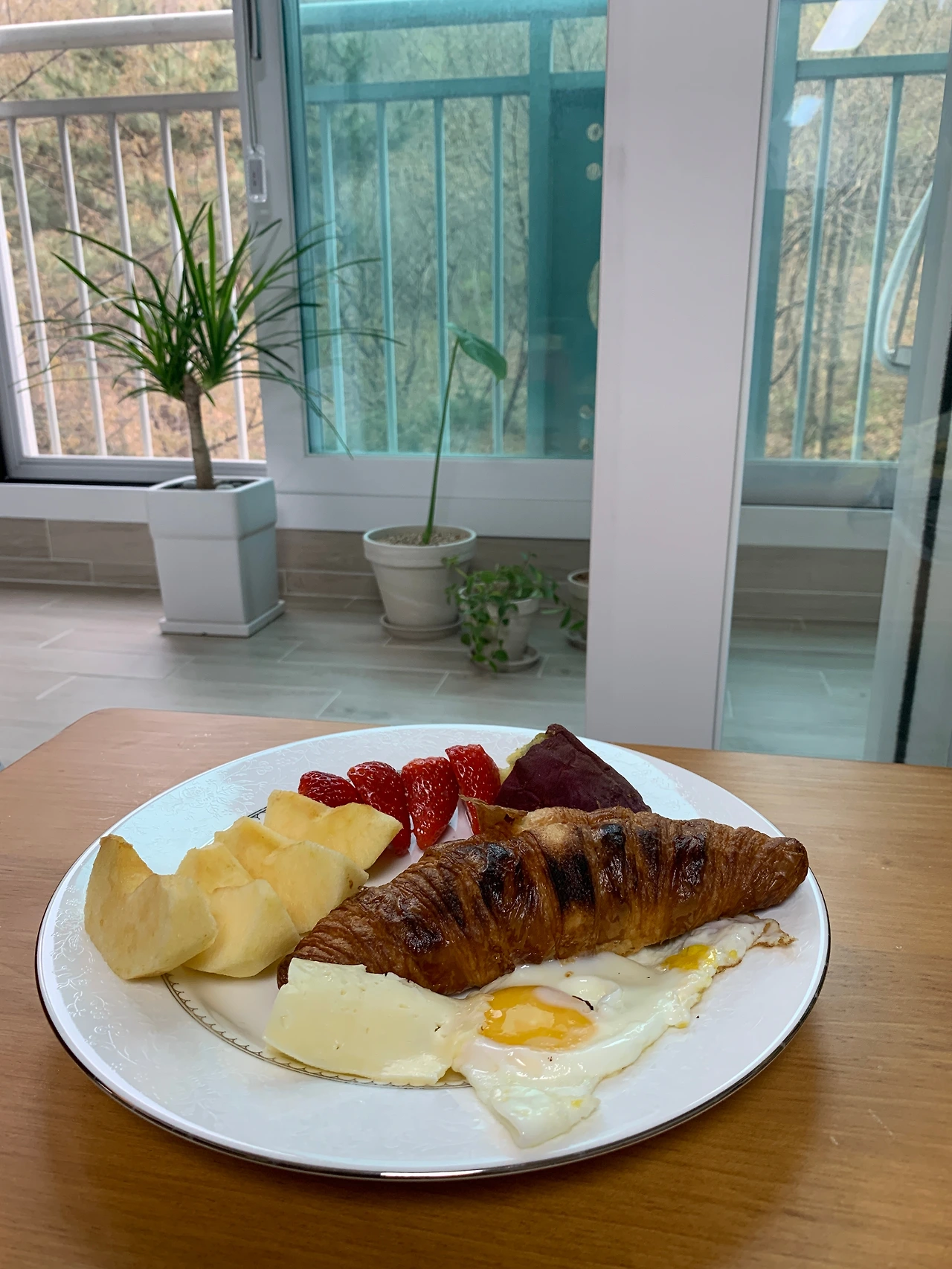 보통 평일 아침은 사과와 고구마 등으로 간단히 먹지만 괜히 코로나라고 해서 더 잘 차려봤다. 코스트코에서 산 냉동 크로와상을 데우고 하바티 치즈를 뜯었다. 냉동 고구마를 해동하고 계란 프라이와 전날 깎아둔 사과, 딸기로 호텔 느낌 나는 조식을 만들었다.
