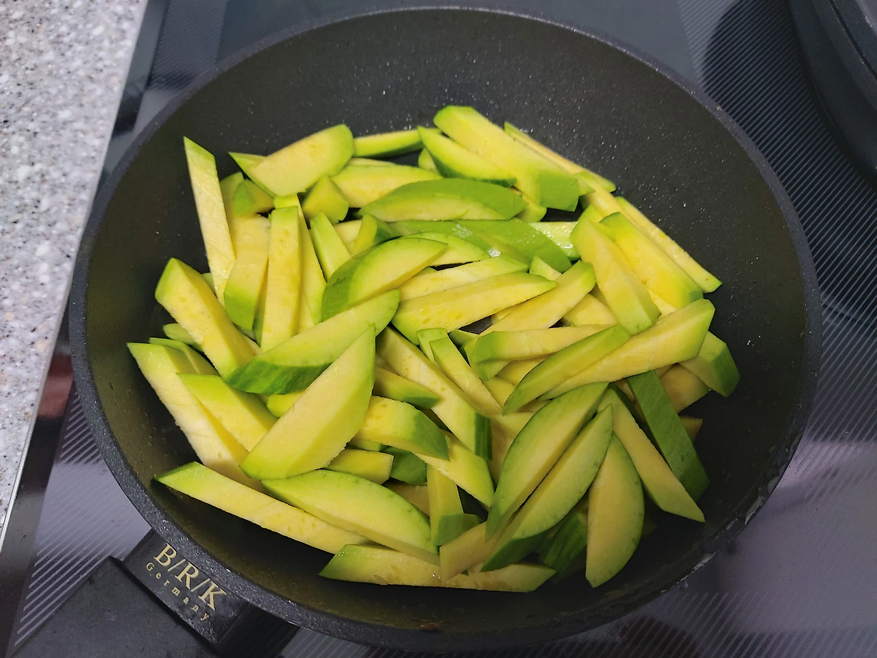 5일 차 저녁부터는 함께 요리를 했다.유튜브에서 본 식감 좋은 애호박 썰기를 시도해봤다.