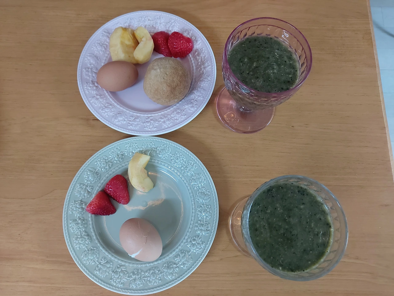 바나나 케일 주스를 메인으로 황금 똥빵, 삶은 계란, 전날 깎아둔 사과와 딸기로 아침상을 차렸다.