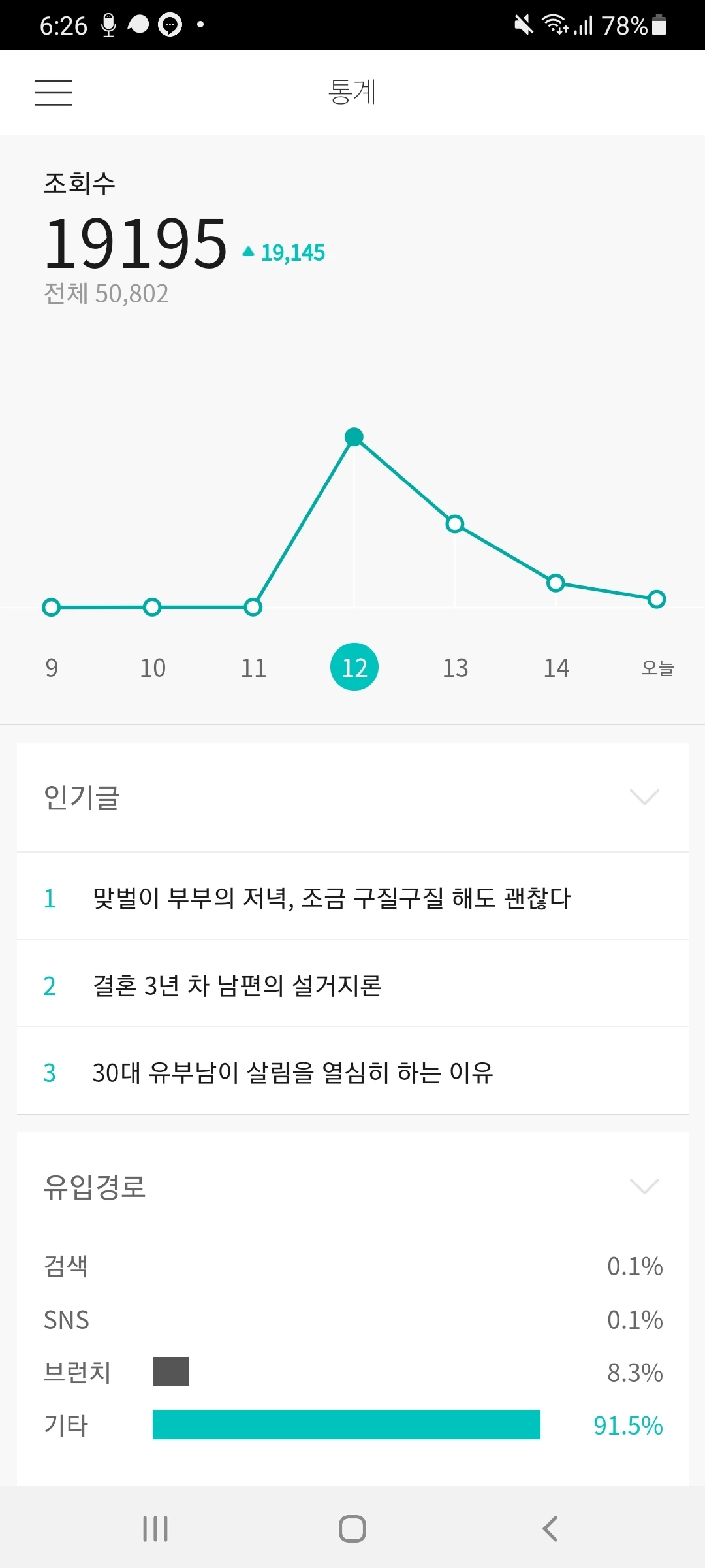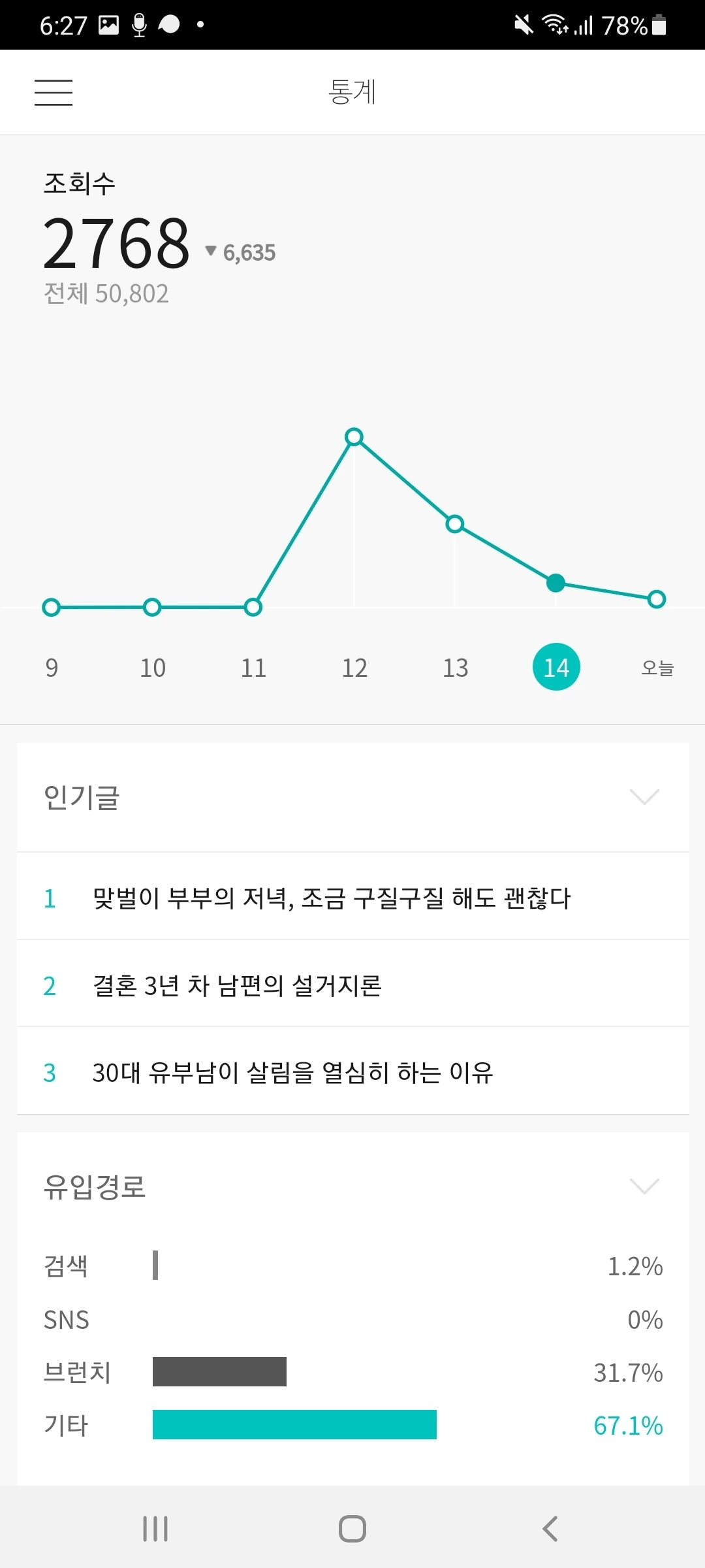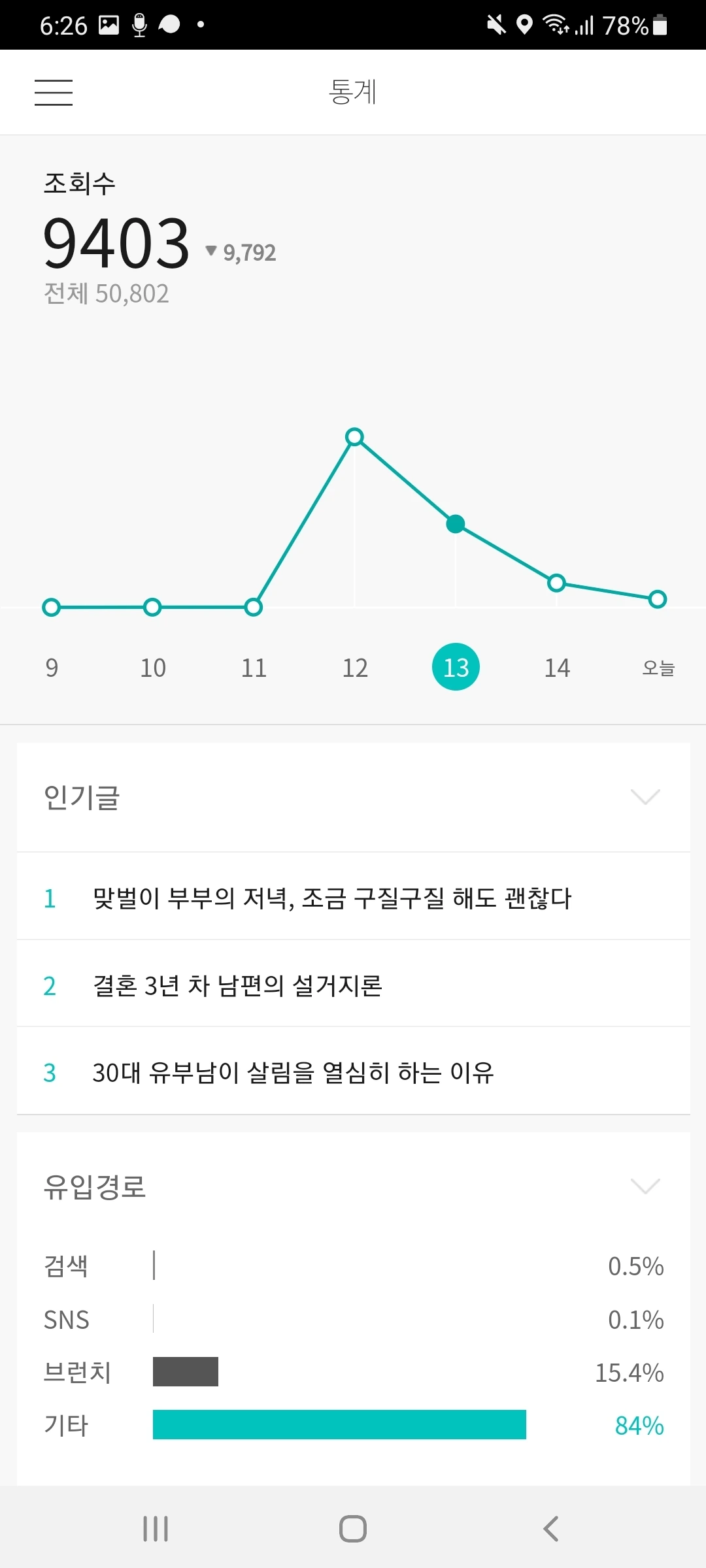 아래는 '맞벌이 부부의 저녁, 조금 구질구질 해도 괜찮다'글의 4일간 조회수 통계다. 기록적인 18,000회를 기록하고 나서 당연히 알고리즘 노출이 줄어들면서 조회수는 뚝뚝 떨어진다. 그런데 자세히 보면 유입경로에서 기타(다음 유입이 90%다)의 비중이 줄어들고 브런치의 비중이 높아진다.