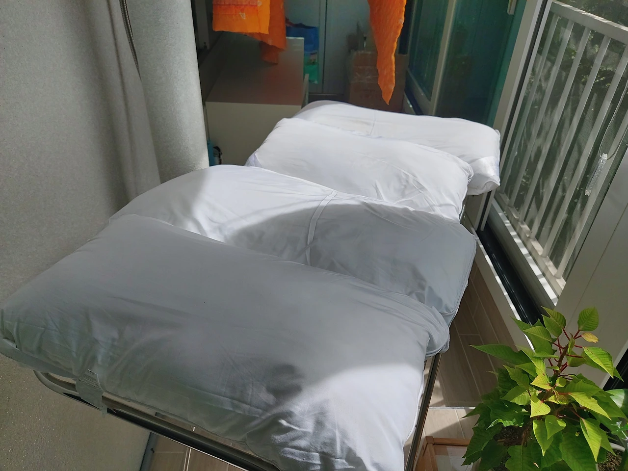 이제 걷어낸 이불솜을 천장 건조대에 올려서 소독한다. 해가 쨍쨍하진 않지만, 아쉬운 대로 걸어서 숨을 쉬게 해 준다. 베개와 쿠션 솜도 건조대에 올려주자. 하얗게 남겨진 매트리스도 숨을 쉬게 놔둔다.