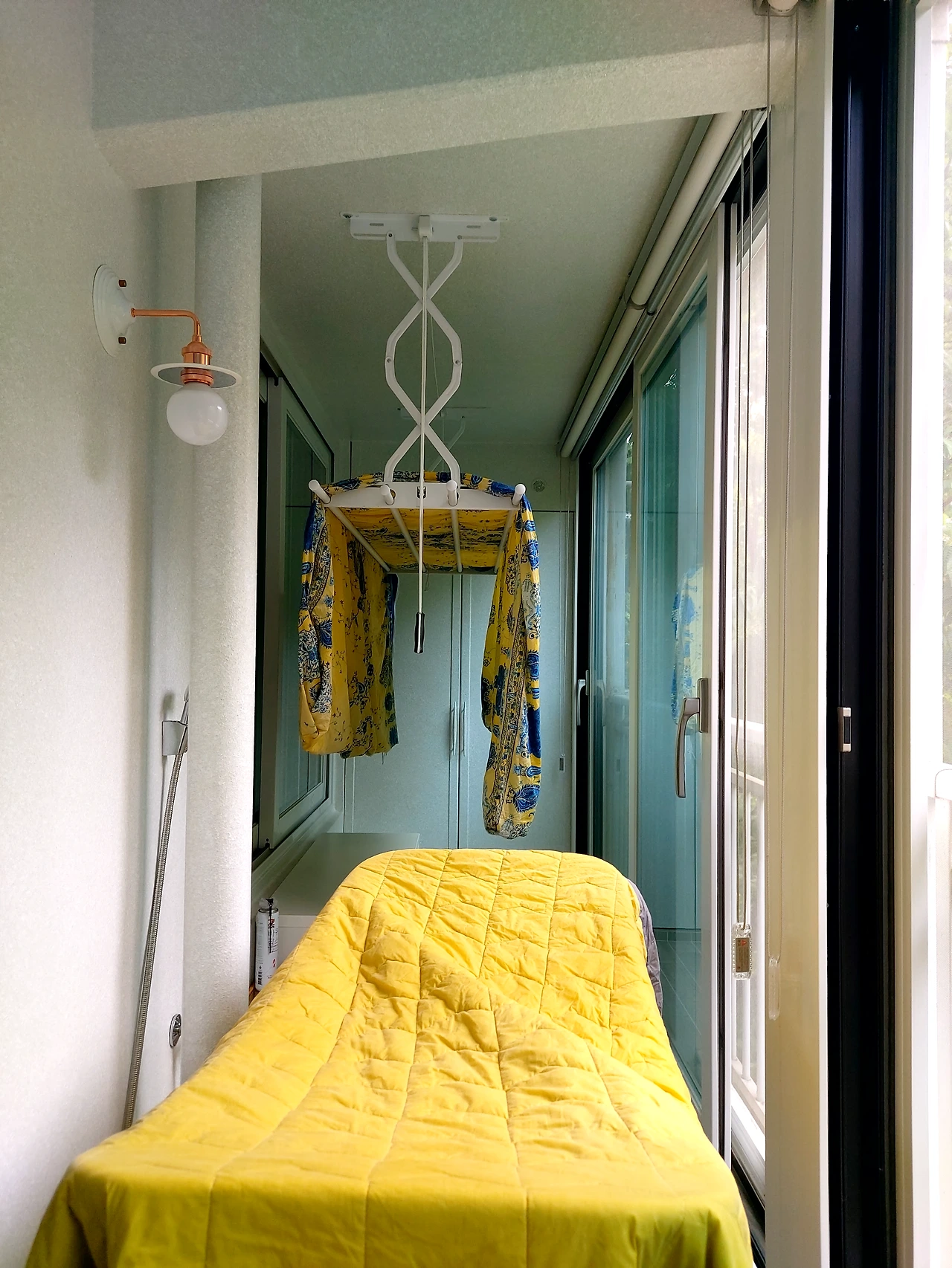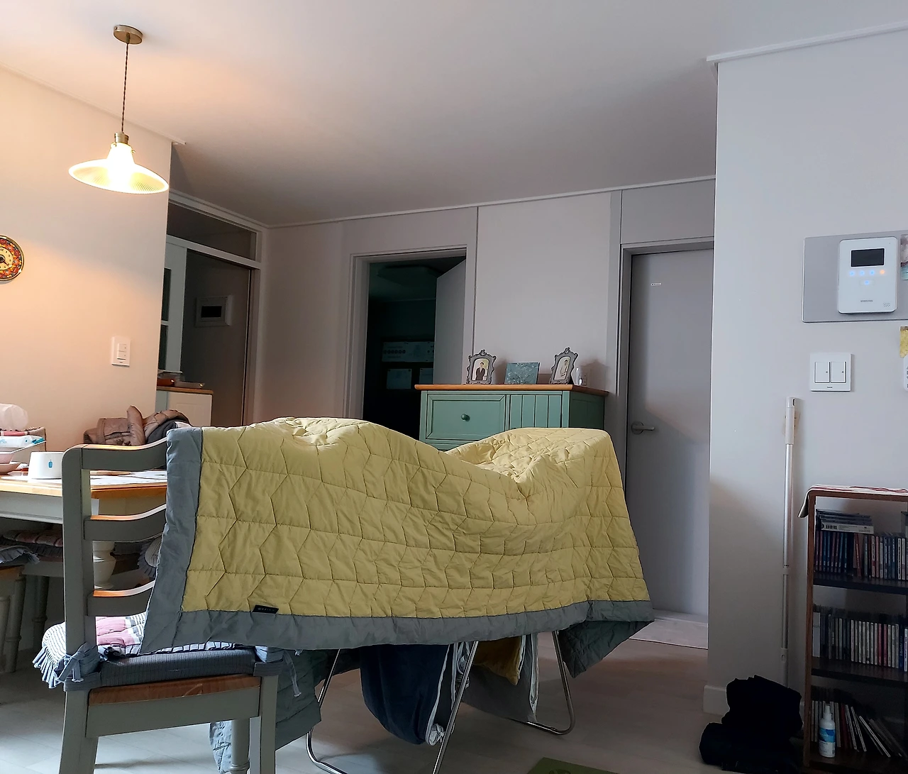 마지막으로 자기 전 천장 건조대에 놓아둔 이불 커버를 건조대에 옮긴다. 아직 건조가 안된 이불 커버는 밤새 실내에서 가습기 역할을 하며 완전히 건조될 것이다.