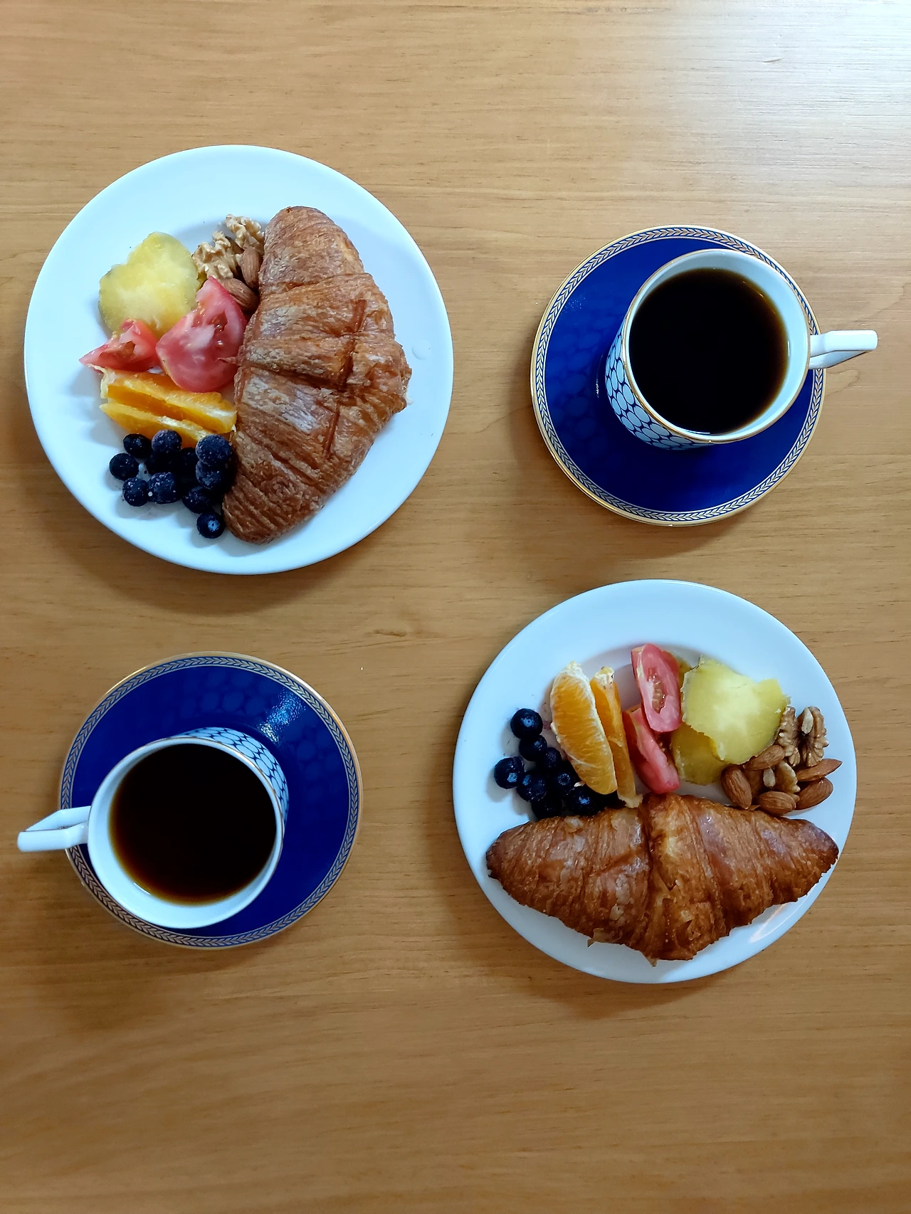 토요일 아침상, 신선재료는 오렌지와 토마토뿐이다 (냉동실에서 보관되는 고구마, 크로와상, 블루베리, 견과류 활용)여력이 된다면 대파와 고추 등은 손질하고 냉동실에 보관하여 한 달 정도 사용이 가능하다. 이렇게 소분한 재료는 요리할 때 시간을 단축시켜준다.