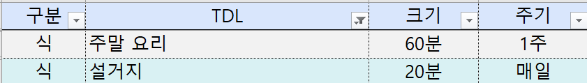 이런 식으로 각자 파악한 집안일의 목록을 작성하되 그 크기와 주기를 나누어서 정리하면, 각자가 담당할 집안일이 의, 식, 주 안에서 더 상세하게 정리된다.