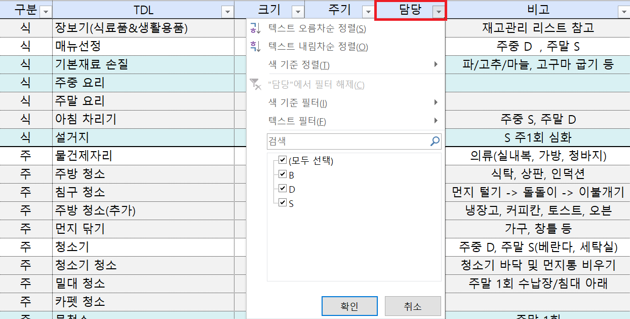 업무 분장표를 사용할 때는 담당 필터를 걸어서 비교해보면 좋다