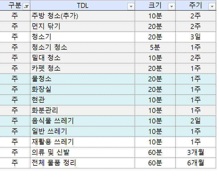 사는 것(청소와 정리)를 과업 쪼개기로 정리한 표