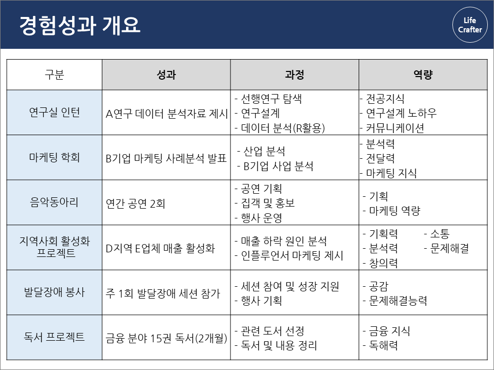 예시로 든 동아리 외 다른 활동도 성과 - 과정 - 역량의 흐름에 따라 정리해두면, 자기소개서 각 항목별 구조와 에피소드를 갖출 수 있을 겁니다.다음의 활동 별 성과 - 과정 - 역량 예시를 참고해서 지금 한 번 정리해보시죠.