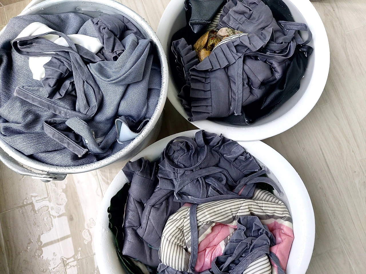 대야에 담가서 찌든 떼를 불리고, 세탁기에 돌려준다.