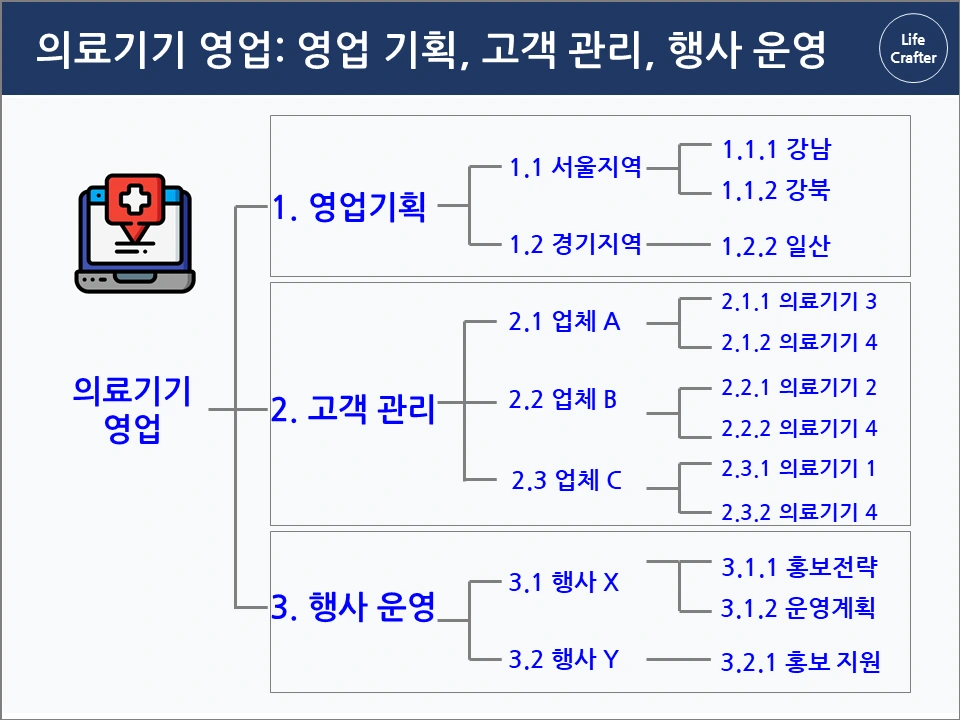 이렇게 뿌리, 줄기, 가지의 순서로 구조화하여 분류하는 것을 나무에 비유하여 로직트리라고도 합니다. 이런 계층 구조화는 기획서 작성에서부터 폴더 관리까지 회사 업무 전반에 활용할 수 있는 기술입니다.