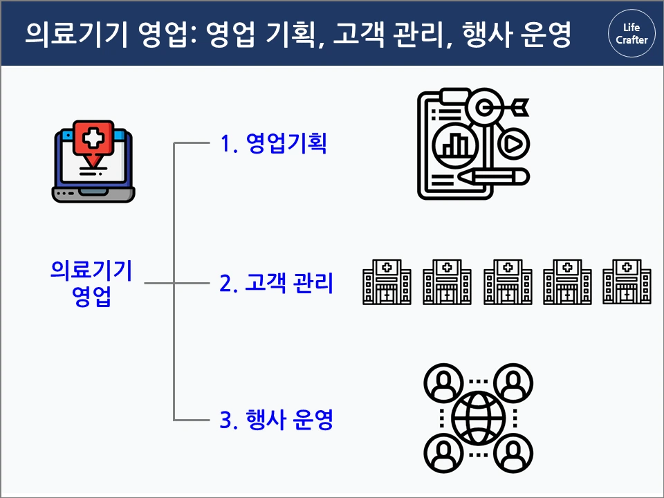 이제 의료기기 영업직을 담당하고 있는 김나우 씨에 적용해보겠습니다. 김나우 씨는 다양한 업무를 하고 있지만 서울과 경기권에 대한 영업 기획, 서울 지역 내 3개의 고객 관리, 연간 행사 운영이라는 세 가지 주요 업무로 일을 분류할 수 있습니다.