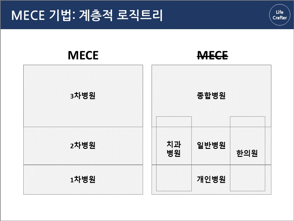 MECE원칙이란 Mutually Exclusive, Collecetively Exhaustive의 약자로, 각 영역이 중복되지 않으면서, 합쳤을 때 누락되지 않도록 구성하는 것입니다. 예를 들어 병원을 분류한다고 생각해봅시다.