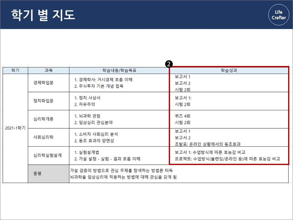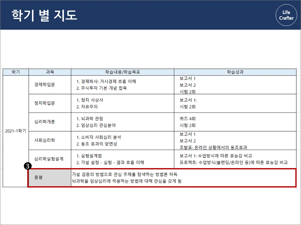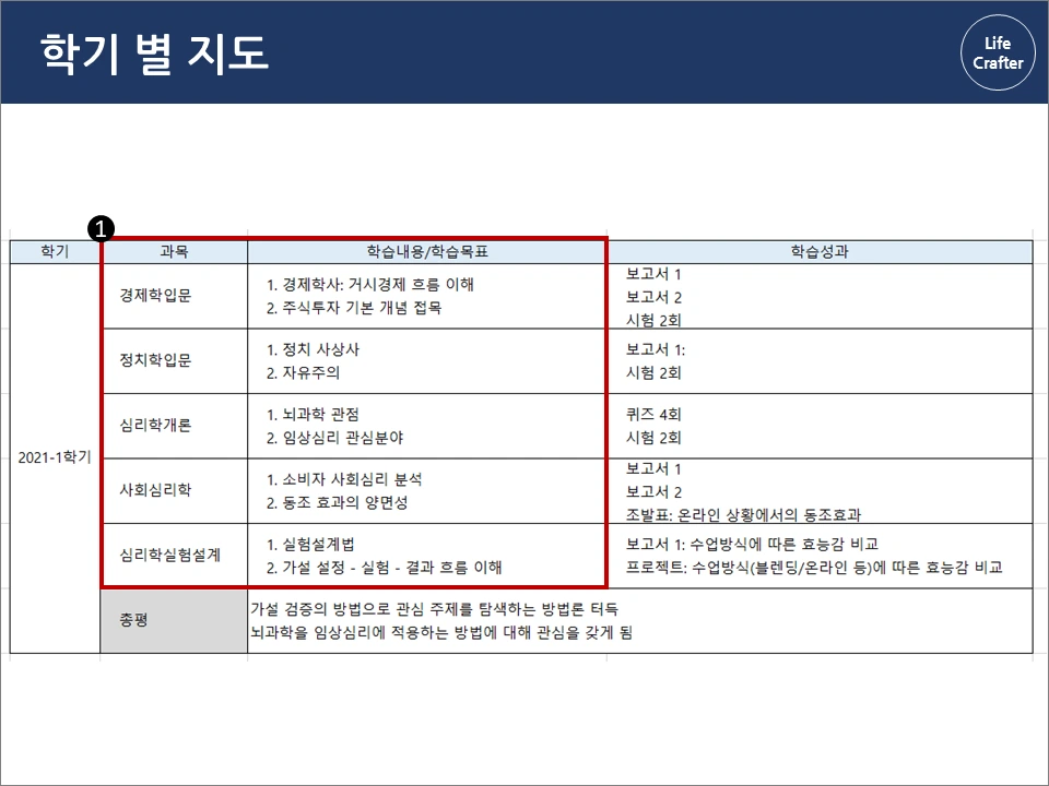 한 학기가 끝나면 각 교과목 별 학습 내용과 성과를 비교해보고 평가합니다. 어떤 부분을 잘했는지, 어떤 부분이 아쉬웠는지를 각 과목별로 정리합니다. 관심 영역에서 원하는 성과를 냈다면, 방학 중 더 깊게 알아보거나 관련 경험을 해봅니다. 마지막으로 한 학기 총평을 적어둡니다.