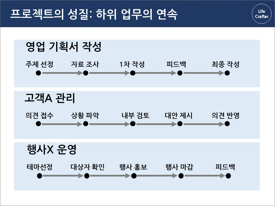 일반적으로 프로젝트라고 불리는 일 외에 사소한 업무도 프로젝트로 볼 수 있습니다. 그 이유는