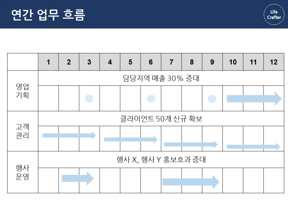 3인칭으로 연간 흐름을 파악했다면, 이제 주요 업무 별 이정표, 즉 하위 목표와 순서를 정할 차례입니다. 고객관리 업무의 연간 목표인