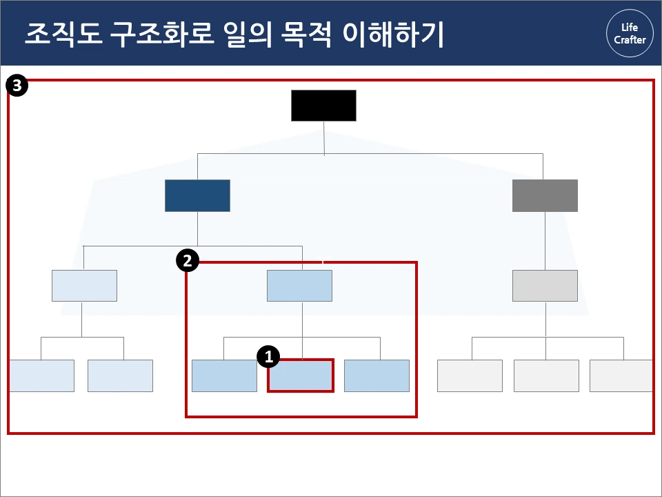 조직도로 일의 목적을 이해하려면, 일의 크기를 파악하는 구조화 기술(클릭)을 적용해볼 수 있습니다. 먼저 나와 다른 팀원들이 하는 일을 구조화하면 팀이 담당하는 일의 크기를 가늠해볼 수 있습니다. 다음으로 다른 팀들의 일을 구조화하여 부서가 맡고 있는 일의 크기를 짐작할 수 있겠죠. 연차가 쌓이고 익숙해지면 구조화를 통해 전체 조직이 담당하는 일의 규모를 파악할 수 있습니다.