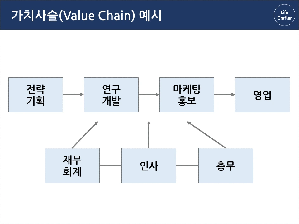 예를 들어 어떤 사업을 하더라도 단계 별 흐름이 있습니다. 먼저 사업 전략을 기획하고 연구개발을 통해 재화나 서비스를 만듭니다. 마케팅을 통해 타깃을 정하고 영업으로 가치를 전달합니다. 여기에 재무, 인사, 총무 등의 기능이 전체 가치사슬을 지원합니다. 각각의 가치와 기능이 순서와 흐름으로 이어져 있다는 겁니다.