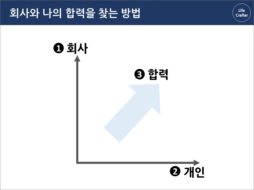 일의 목적을 이해하려면 회사와 나, 양쪽 입장을 들어볼 필요가 있습니다. 회사는 나라는 구성원을 활용하여 달성하려는 목적이 있습니다. 반대로 나라는 개인도 회사를 통해 이루려는 것이 있지요. 그래서 먼저 회사가 원하는 것을 알아보고, 내가 이루려는 것과 비교한 다음, 합력을 키우는 방향으로 나아가야 합니다.