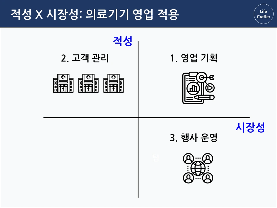 의료기기 영업직을 맡고 있는 김부린 씨의 업무를 예로 들어 적성과 시장성의 두 기준에 따라 분석해보겠습니다.