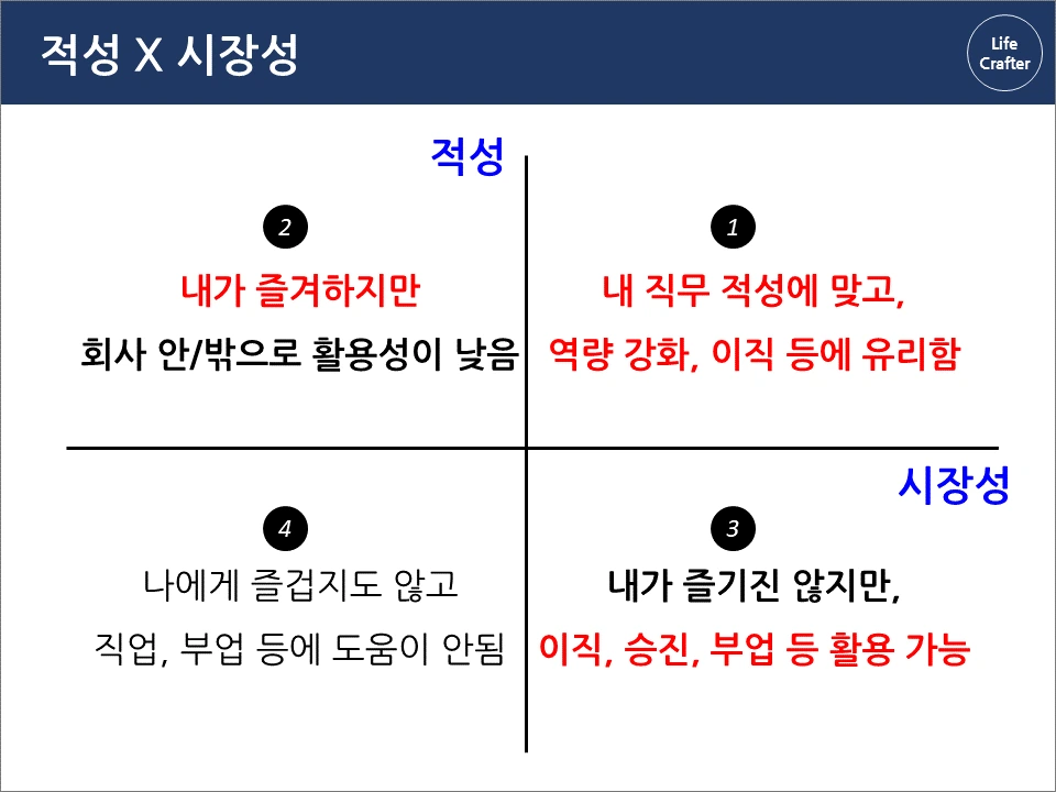 시장성은 승진이나 이직, 부업 등 다른 기회로 연결, 확장될 수 있는 영역을 뜻합니다. 시장성은 현재 회사와 직무뿐만 아니라 이직, 사이드 프로젝트, 사업 등 그 대상이 되는 시장(Market) 다양합니다. 따라서 적성과 다르게 시장성은 중요시하는 분야를 기준으로분석이 필요한 2차적인 기준입니다. 본인이 특별히 우선시하는 시장이 없다면 어떤 분야에서도 활용 가능한 기획, 마케팅, 영업, 글쓰기, 디자인, 영상기술, 커뮤니케이션 등의 공통기술을 연마해두면 됩니다.