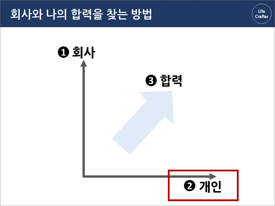 이제 개인, 나의 목적을 분석하는 단계입니다. 내가 타고 있는 배가 어디로 향하는지 고민해봤다면, 반대로 나는 이 배를 타고 어디를 가고 싶은지 생각해 보는 거죠.(이 접근법은 경력관리의 기본 원리로 다시 등장할 겁니다.)