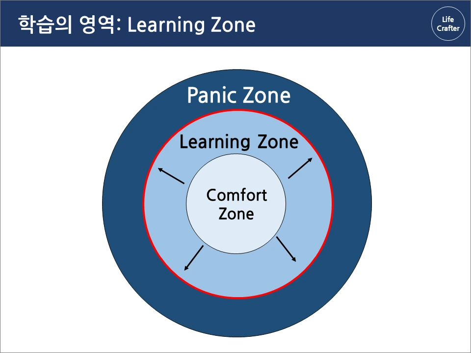 대표적인 방법으로, 학습할 수 있는 새로운 영역을 계속 넓혀가는 전략이 있습니다. 교육학에서는 성장과 학습이 일어나는 영역을 설명하기 위해 경험을 세 구역(Zone)으로 구분하는데요.