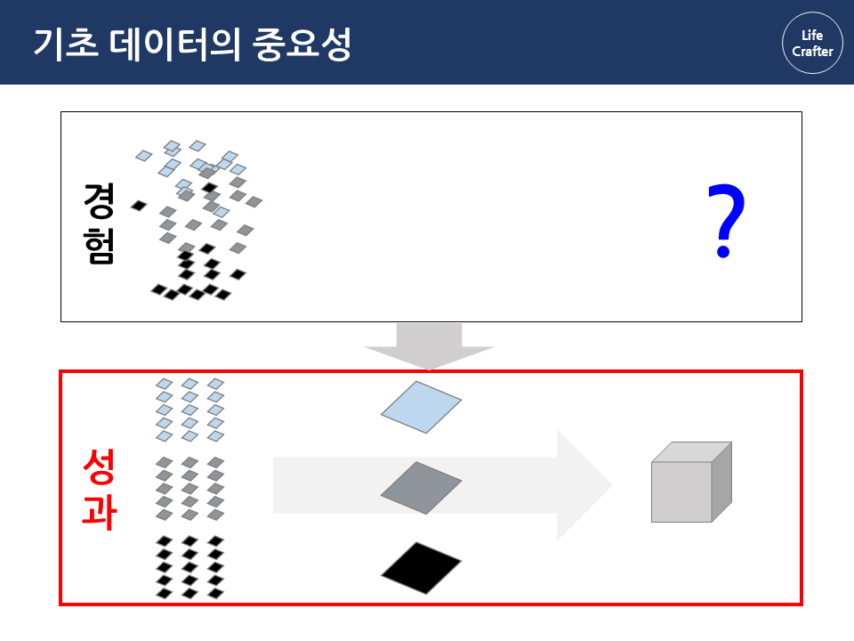 마찬가지로 개인의 경험을 해석하기 위해서는 인식과 분석이 가능하도록 라벨링 할 필요가 있습니다. 우리가 경험을 통해 성장하려고 할 때, 데이터로 정리되지 않았다면, 발전은커녕 관리조차도 어려울 것입니다. 경험 데이터를 작성할 때 핵심은 객관화의 원리에 따라 경험을 인식 가능하도록 정량적(Quantative) 또는 정성적(Qualitative)으로 정리하는 것입니다.