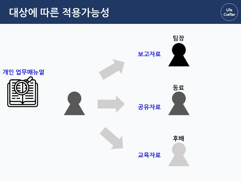 그 이유는 전문직종과 다르게 일반 직장인은 소속된 회사, 산업, 담당직무, 업무 등의 요소가 복합적으로 작용하는 영역에서 일하기 때문입니다. 같은 업계에 속해서 동일한 직무를 담당하더라도 회사의 규모, 특성 등에 따라 문제 해결 방식은 다릅니다. 따라서 직장인은 담당 업무를 효과적으로 수행하면서도 문제 해결 노하우를 축적하고 변화하는 상황에도 사용할 수 있도록 정리해두어야 하는 것입니다.