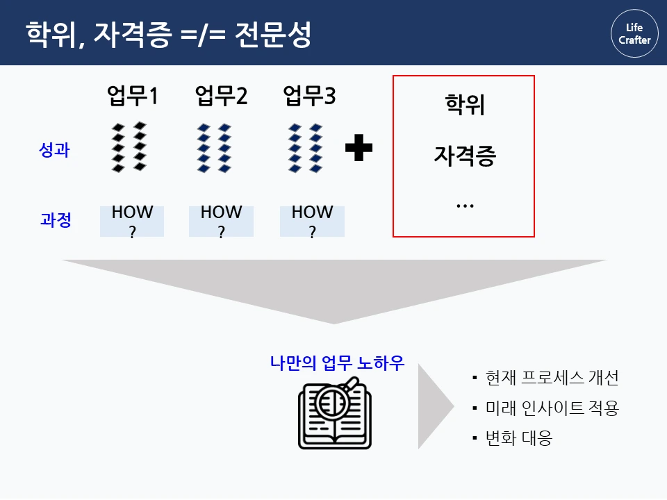 전문성을 갖추기 위해 전문자격증을 취득하거나, 학위과정을 밟는 것도 같은 맥락에서 파악할 필요가 있습니다. 자격증과 학위는 정량적인 요소로 나의 전문성을 뒷받침하는 유용한 도구가 될 수 있습니다. 하지만 습득한 것을 통합하지 못한다면, 전문성을 뒷받침하는데 큰 도움이 되지 않을 수도 있습니다.
