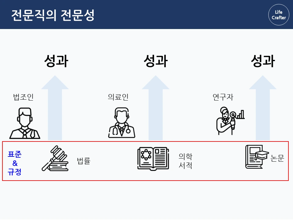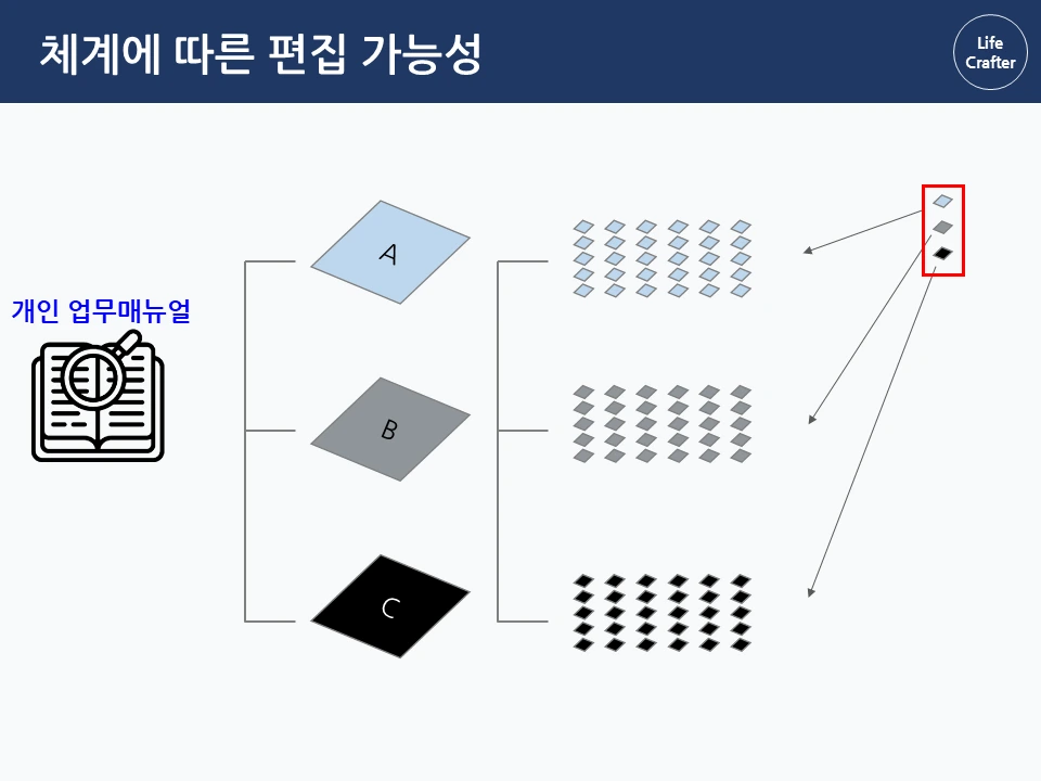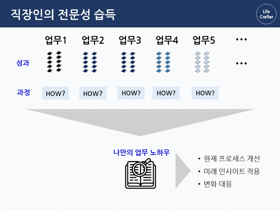 이러한 맥락에서 전문성을 쌓는 것의 시작은 담당 업무 노하우를 교과서처럼 하나의 통합본으로 만드는 것이라고 할 수 있습니다. 직장인의 전문성은 변화하는 환경에서 최적의 문제 해결을 하는 것이기 때문에 경력을 쌓고, 교육을 받고, 자격증을 취득하는 것은 전체 노하우 체계에 맞게 정리되어야 합니다.