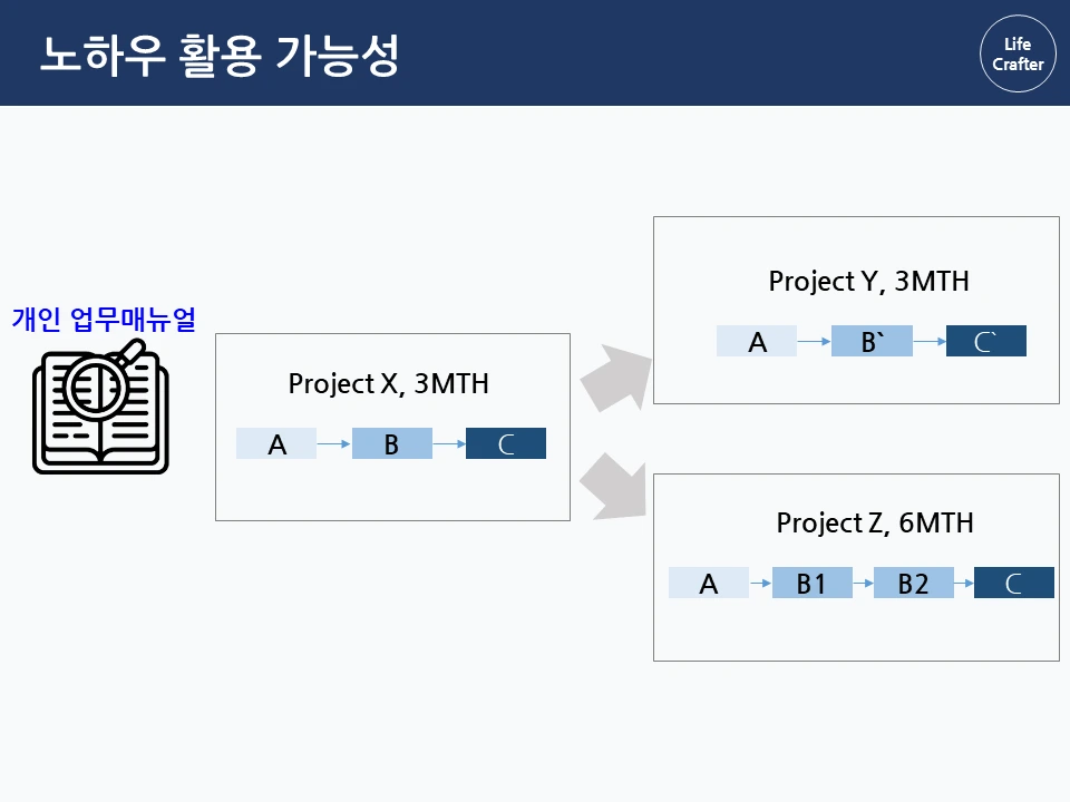 첫 번째로 업무 매뉴얼은 본인이 참고할 수 있는 전문자료가 됩니다. 3개월 규모의 프로젝트를 관리하고 학습한 내용을 정리해두면, 유사한 규모의 프로젝트를 담당할 때 활용할 수 있습니다. 더 큰 프로젝트를 맡게 되거나 이직을 하더라도, 이전 노하우를 활용하여 규모나 특성에 맞게 적용할 수 있습니다.