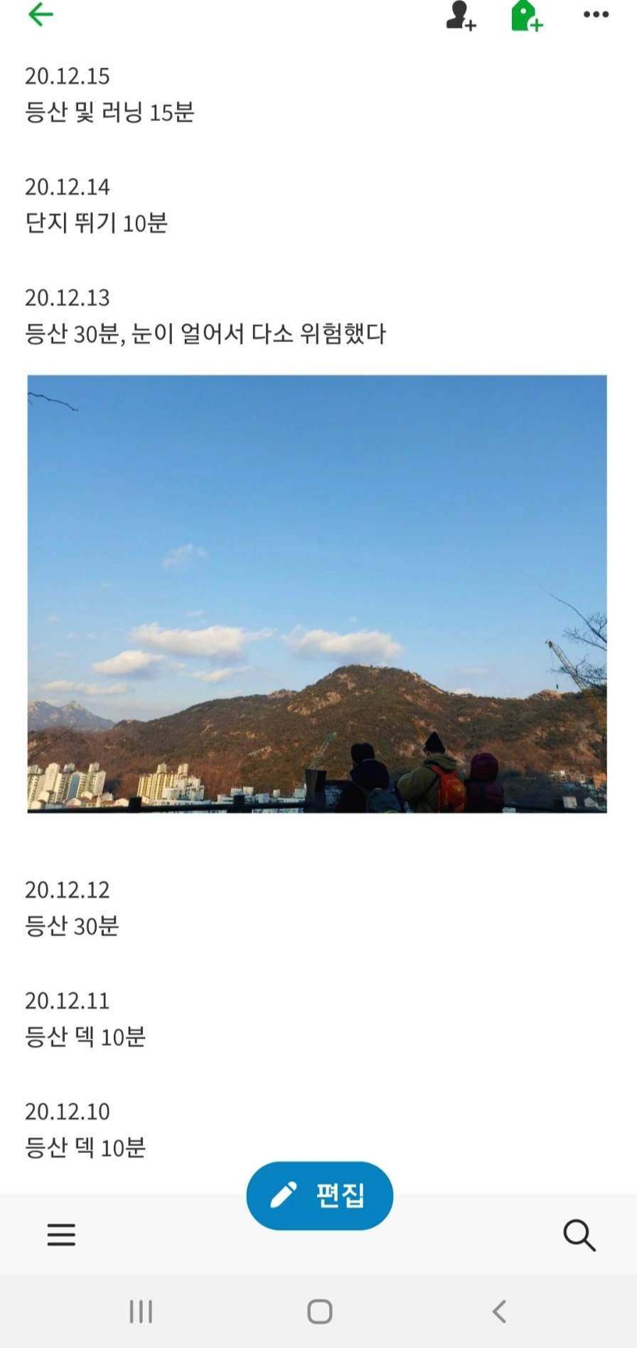 2020년 운동일지. 10분 등산로 운동과 등산을 병행했다.