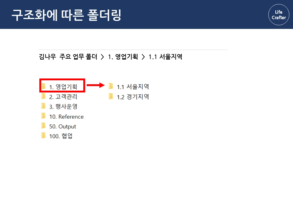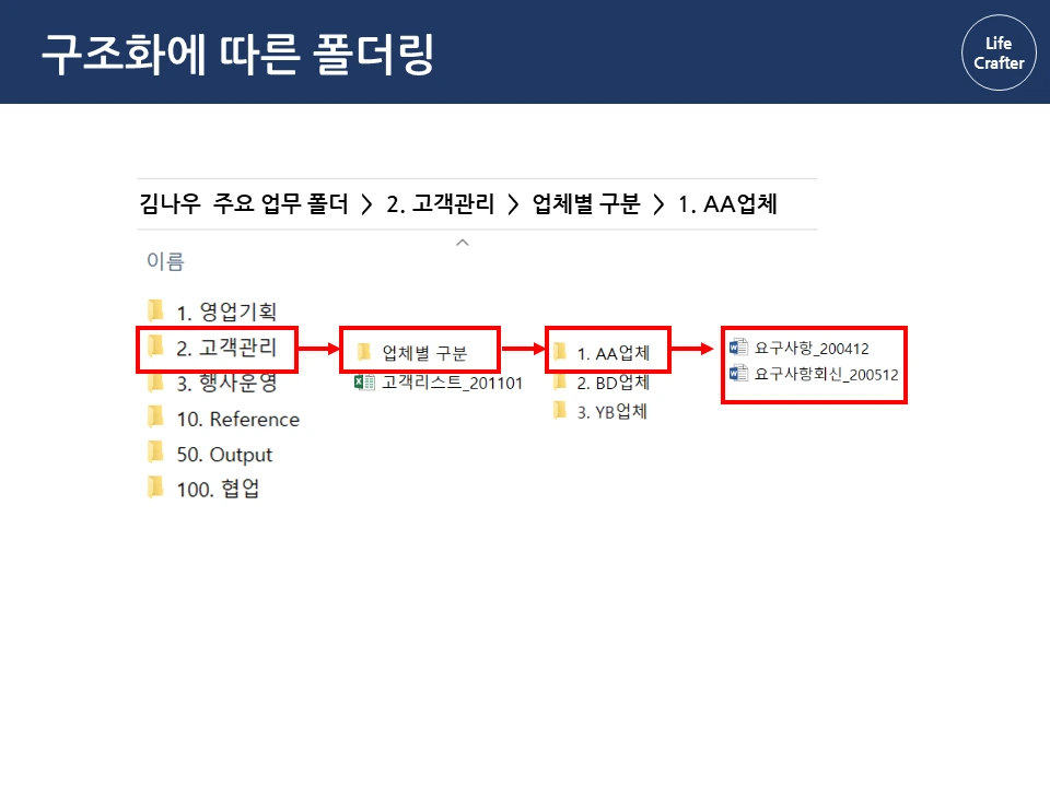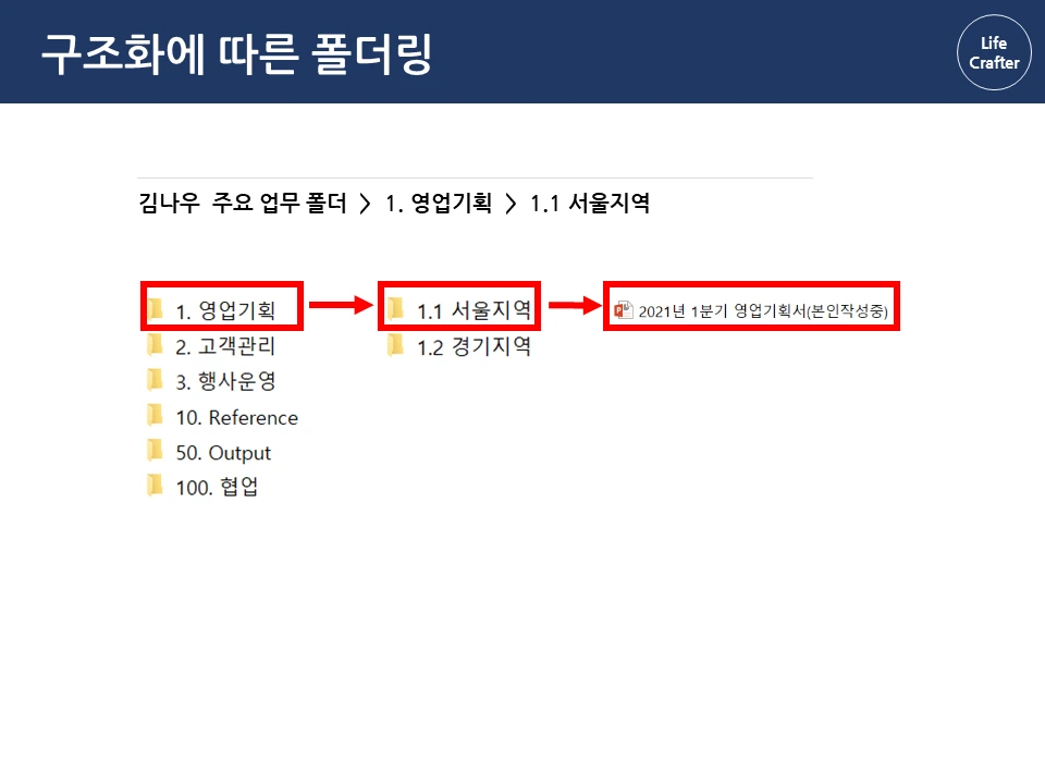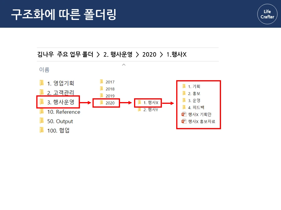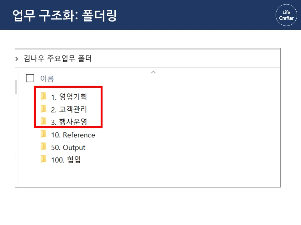 아래로 바탕화면에 뿌려진 수 많은 파일과 폴더들...한 번 쌓이면 정리할 엄두가 안 납니다. 일을 많이 한 것 같긴 한데, 정작 필요할 때 찾으려면 잘 안 보일 때도 많죠. 그런데 회사에 유독 필요한 자료와 파일을 잘 찾는 사람들이 있습니다. 몇 년 전 자료도 어떻게 기억하는지 금방 찾아내서 다른 이들의 시간을 아껴주기도 하 죠. 그래서 이번 파일과 폴더 정리 시리즈에서는 이런 프로 파일러(?)의 비밀을 밝혀보려고 합니다 ! 자료 관리 원칙(1) 체계성의 원리 자료 관리의 첫 번째 원칙은 자료를 하나의 체계로 구성해서 저장하는 것입니다. 우리가 정보를 찾는 방법은 크게 두 가지인데요, 먼저 로직에 따른 체계적 접근입니다. 대표적인 체계적 정보가 바로 책입니다. 책은 각 장과 하위 목차에 따라 정보가 체계적으로 구성되어 있습니다. 그래서 무턱대고 첫 페이지부터 읽기보다 목차를 먼저 보는 것이 효과적입니다. 목차의 장을 먼저 보고, 하위 목차에 따라 상세 내용을 찾아가면 정보를 더 체계적으로 파악할 수 있죠. 김정운 작가는 ‘에디톨로지’에서 이와 같은 정보를 계층적 지식 구조 라고 설명합니다. 추상적인 상위 개념에서 시작하여 가장 구체적인 하위 내용까지 계층적으로 구성되기 때문입니다. 마찬가지로 파일 정리도 업무 단위별로 먼저 구조를 정해 폴더를 구분하고, 각 폴더 안에 다시 상세 업무 별 하위 폴더를 만드는 방식으로 정리하면 체계적으로 구성할 수 있습니다. 로직에 따른 폴더링 업무 구조화에서 활용한 동일한 로직으로 자료를 계층적으로 구조화합니다. 업무 구조화에 대한 글은 아래 링크를 통해 확인하실 수 있습니다. 관련 글 김나우 씨의 경우, 영업 기획, 고객 관리, 행사 운영이라는 세 개의 주요 업무를 수행하고 있습니다. 주요 업무 와 하위 업무에 따라 폴더를 계속 만듭니다. 이때 숫자 넘버링을 통해 계층 과 수준을 나누고 순차적으로 접근하는 것이 중요합니다. 세 주요 업무에 따른 업무 폴더를 구성했습니다. 업무폴더 첫 구성 1. 영업기획 영업 기획은 지역 별 특성에 따른 전략을 정하는 것이 중요합니다. 현재 영업 기획 업무는 서울지역과 경기지역을 중심으로 이루어집니다. 업무 비중이 제일 큰 서울 지역은 1.1로, 그다음 순위인 경기 지역은 1.2로 넘버링을 하고 폴더별로 구분합니다. 지역이 추가되면 1.3으로 폴더를 만들면 되겠죠? 서울지역의 업무에서는 2021년 1분기의 영업 기획서 파트를 작성하고 있습니다. 이 폴더에 2021년 전체 영업기획에 필요한 기초자료와 분기별 인사이트를 자료를 넣고 작업합니다. 2. 고객 관리 고객관리는 업체 별 요구에 따라 대응하는 것이 핵심이기 때문에, 업체 별 폴더를 만들어서 관리합니다. 현재 담당하고 있는 업체는 AA, BD, YB 3개의 업체입니다. 각 업체의 요구 사항이 발생할 때마다 관련 내용을 정리하여 보고하고, 유관 부서에 협조 요청을 하여 해결합니다. 관련 자료는 제목과 날짜 형식에 맞춰 저장해둡니다. 팀 전체의 고객 리스트는 언제든지 참고할 수 있게 상위 폴더에 배치합니다. 3. 행사 운영 행사 운영은 매년 정해진 일정과 테마에 따라 진행하기 때문에 연도 별 운영한 행사를 프로세스 별로 분류합니다. ( 연도-프로세스 순서) 2020년에는 행사 X와 Y가 진행 예정이므로 2020년 폴더 행사 X와 Y를 구분하여 폴더를 만듭니다. 행사 X는 주요 담당 행사로 기획안과 홍보자료 등을 작성해야 합니다. 업무 흐름 글에서 이정표를 나눈 것과 같이 기획 – 홍보 – 운영 – 피드백 등의 중간 과정에 따라 자료를 구분하여 분류합니다. 관련 글 첫 번째 체계성의 원리에 따라 계층 구조로 파일을 배치했다면, 바탕화면에 흩어진 자료가 어느 정도 제 위치를 찾았을 겁니다. 이렇게 정리를 해두면 각 업무 별 계층과 흐름 이 자연스럽게 파악되어 나중에 찾기 편해집니다. 사실 계층 원리만 이해해도 일머리가 생깁니다. 책의 목차를 쓰듯이 나만의 업무 로직을 만들 수 있기 때문이죠. 다음으로 직관성의 원리에 따른 파일 저장을 이해한다면, 더욱 빠르고 효과적으로 자료를 활용할 수 있습니다. 파일과 폴더관리 시리즈는 영상으로도 보실 수 있습니다.