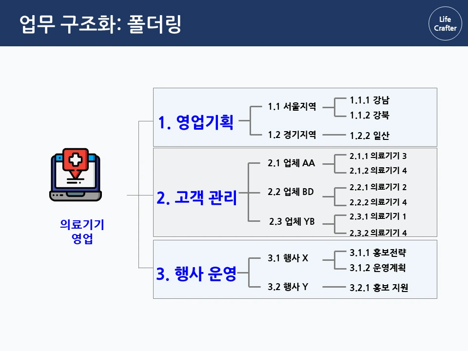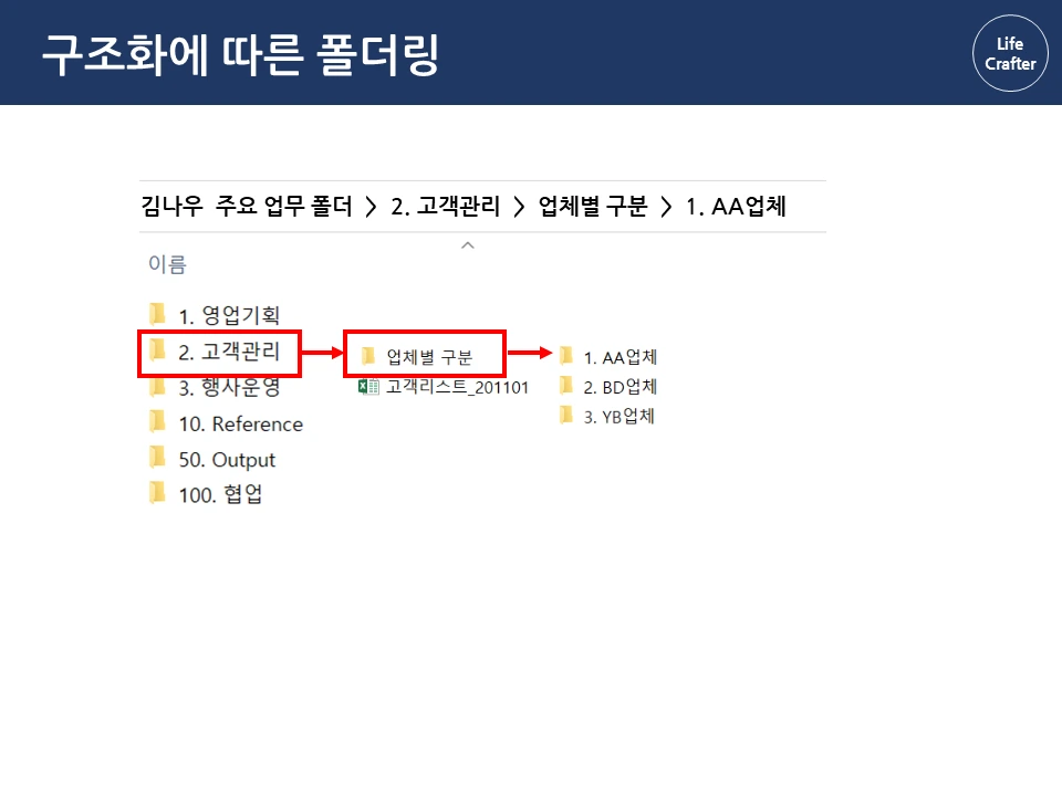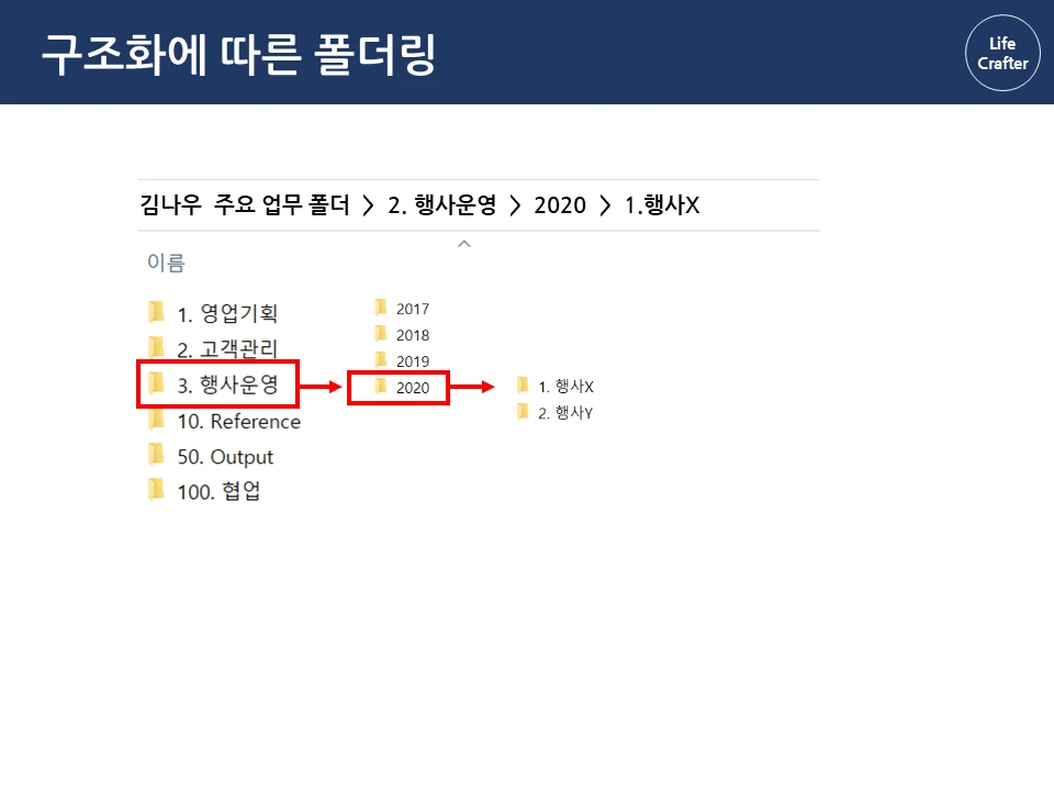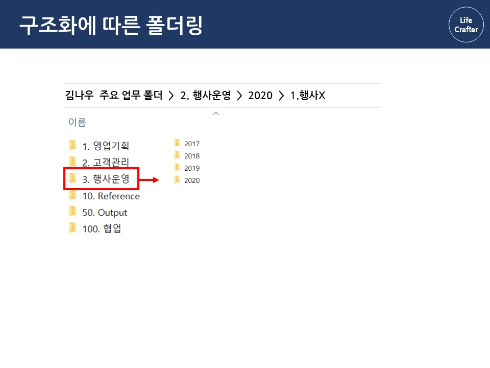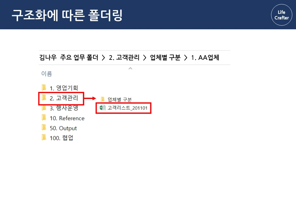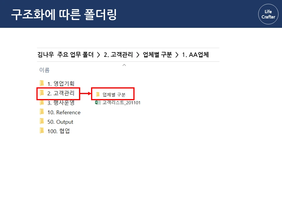 아래로 바탕화면에 뿌려진 수 많은 파일과 폴더들...한 번 쌓이면 정리할 엄두가 안 납니다. 일을 많이 한 것 같긴 한데, 정작 필요할 때 찾으려면 잘 안 보일 때도 많죠. 그런데 회사에 유독 필요한 자료와 파일을 잘 찾는 사람들이 있습니다. 몇 년 전 자료도 어떻게 기억하는지 금방 찾아내서 다른 이들의 시간을 아껴주기도 하 죠. 그래서 이번 파일과 폴더 정리 시리즈에서는 이런 프로 파일러(?)의 비밀을 밝혀보려고 합니다 ! 자료 관리 원칙(1) 체계성의 원리 자료 관리의 첫 번째 원칙은 자료를 하나의 체계로 구성해서 저장하는 것입니다. 우리가 정보를 찾는 방법은 크게 두 가지인데요, 먼저 로직에 따른 체계적 접근입니다. 대표적인 체계적 정보가 바로 책입니다. 책은 각 장과 하위 목차에 따라 정보가 체계적으로 구성되어 있습니다. 그래서 무턱대고 첫 페이지부터 읽기보다 목차를 먼저 보는 것이 효과적입니다. 목차의 장을 먼저 보고, 하위 목차에 따라 상세 내용을 찾아가면 정보를 더 체계적으로 파악할 수 있죠. 김정운 작가는 ‘에디톨로지’에서 이와 같은 정보를 계층적 지식 구조 라고 설명합니다. 추상적인 상위 개념에서 시작하여 가장 구체적인 하위 내용까지 계층적으로 구성되기 때문입니다. 마찬가지로 파일 정리도 업무 단위별로 먼저 구조를 정해 폴더를 구분하고, 각 폴더 안에 다시 상세 업무 별 하위 폴더를 만드는 방식으로 정리하면 체계적으로 구성할 수 있습니다. 로직에 따른 폴더링 업무 구조화에서 활용한 동일한 로직으로 자료를 계층적으로 구조화합니다. 업무 구조화에 대한 글은 아래 링크를 통해 확인하실 수 있습니다. 관련 글 김나우 씨의 경우, 영업 기획, 고객 관리, 행사 운영이라는 세 개의 주요 업무를 수행하고 있습니다. 주요 업무 와 하위 업무에 따라 폴더를 계속 만듭니다. 이때 숫자 넘버링을 통해 계층 과 수준을 나누고 순차적으로 접근하는 것이 중요합니다. 세 주요 업무에 따른 업무 폴더를 구성했습니다. 업무폴더 첫 구성 1. 영업기획 영업 기획은 지역 별 특성에 따른 전략을 정하는 것이 중요합니다. 현재 영업 기획 업무는 서울지역과 경기지역을 중심으로 이루어집니다. 업무 비중이 제일 큰 서울 지역은 1.1로, 그다음 순위인 경기 지역은 1.2로 넘버링을 하고 폴더별로 구분합니다. 지역이 추가되면 1.3으로 폴더를 만들면 되겠죠? 서울지역의 업무에서는 2021년 1분기의 영업 기획서 파트를 작성하고 있습니다. 이 폴더에 2021년 전체 영업기획에 필요한 기초자료와 분기별 인사이트를 자료를 넣고 작업합니다. 2. 고객 관리 고객관리는 업체 별 요구에 따라 대응하는 것이 핵심이기 때문에, 업체 별 폴더를 만들어서 관리합니다. 현재 담당하고 있는 업체는 AA, BD, YB 3개의 업체입니다. 각 업체의 요구 사항이 발생할 때마다 관련 내용을 정리하여 보고하고, 유관 부서에 협조 요청을 하여 해결합니다. 관련 자료는 제목과 날짜 형식에 맞춰 저장해둡니다. 팀 전체의 고객 리스트는 언제든지 참고할 수 있게 상위 폴더에 배치합니다. 3. 행사 운영 행사 운영은 매년 정해진 일정과 테마에 따라 진행하기 때문에 연도 별 운영한 행사를 프로세스 별로 분류합니다. ( 연도-프로세스 순서) 2020년에는 행사 X와 Y가 진행 예정이므로 2020년 폴더 행사 X와 Y를 구분하여 폴더를 만듭니다. 행사 X는 주요 담당 행사로 기획안과 홍보자료 등을 작성해야 합니다. 업무 흐름 글에서 이정표를 나눈 것과 같이 기획 – 홍보 – 운영 – 피드백 등의 중간 과정에 따라 자료를 구분하여 분류합니다. 관련 글 첫 번째 체계성의 원리에 따라 계층 구조로 파일을 배치했다면, 바탕화면에 흩어진 자료가 어느 정도 제 위치를 찾았을 겁니다. 이렇게 정리를 해두면 각 업무 별 계층과 흐름 이 자연스럽게 파악되어 나중에 찾기 편해집니다. 사실 계층 원리만 이해해도 일머리가 생깁니다. 책의 목차를 쓰듯이 나만의 업무 로직을 만들 수 있기 때문이죠. 다음으로 직관성의 원리에 따른 파일 저장을 이해한다면, 더욱 빠르고 효과적으로 자료를 활용할 수 있습니다. 파일과 폴더관리 시리즈는 영상으로도 보실 수 있습니다.