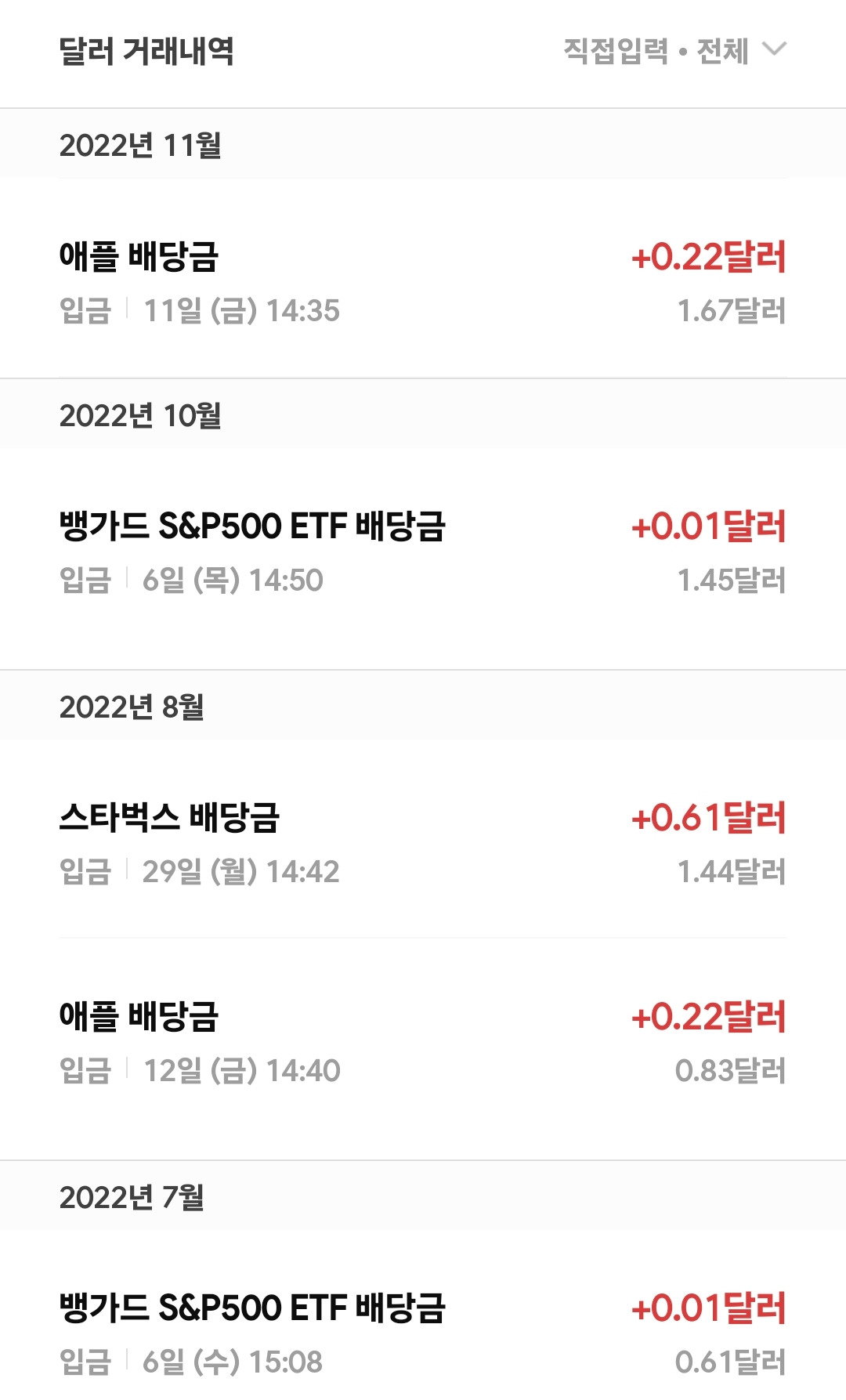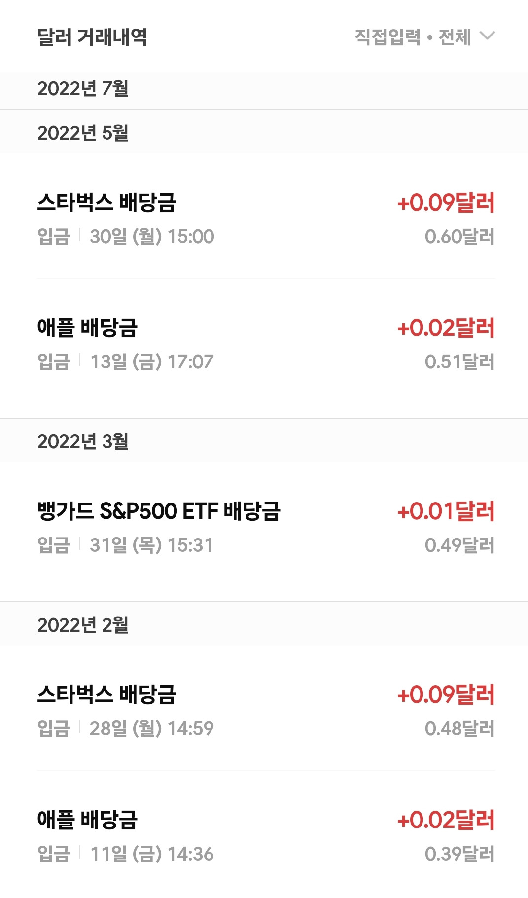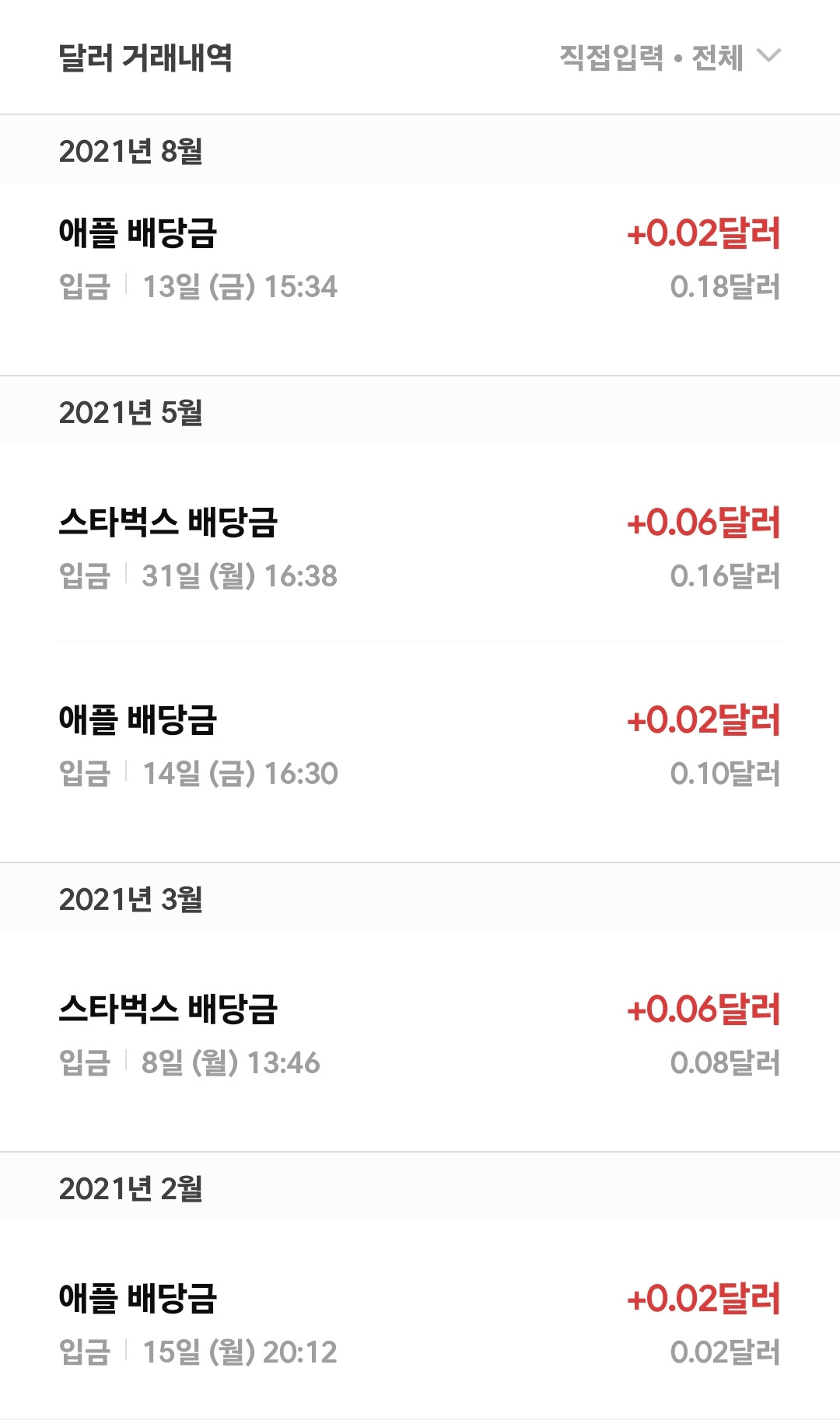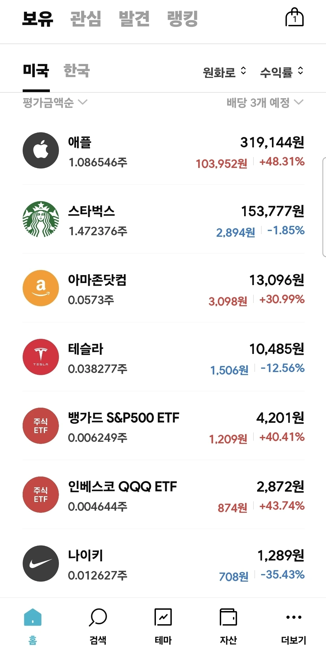 주린이었지만 코로나 때 유튜브 광고로 미니스탁을 알게 되고 소수점 투자를 했다. 미국 지수에 투자하고 싶었지만 방법을 몰랐다. 그것 대신 남편이 즐겨 마시는 스타벅스, 이름이 친숙한 애플, 나이키, 아마존, 테슬라 같은 우량주를 매수했다. 테슬라와 나이키는 마이너스였지만 워낙 적은 금액이라 방치하고 애플, 스타벅스는 3개월 동안 매주 1만 원씩 매수해서 귀엽게도 1주 이상을 모았다. 종종 배당금 알림톡을 보며 어디에 그게 쌓이는지도 모르고 그냥 좋았다. 배당금을 재투자할 생각도, 배당성장주를 더 매수할 생각도 못했다.