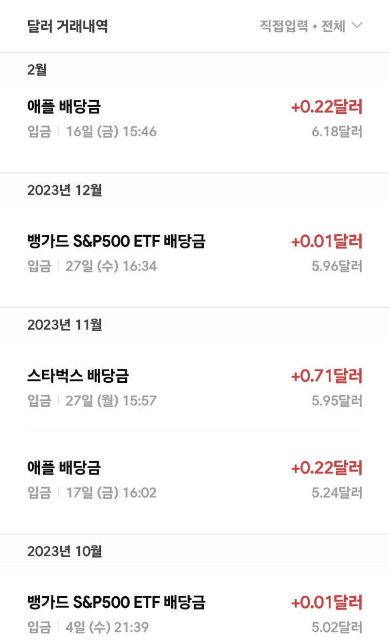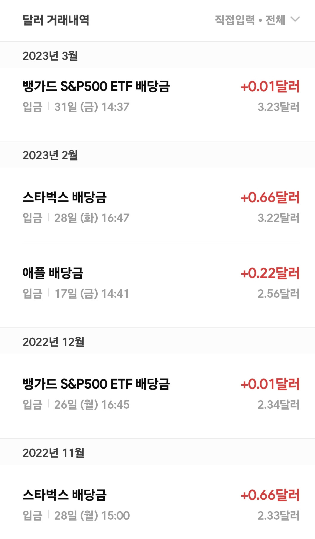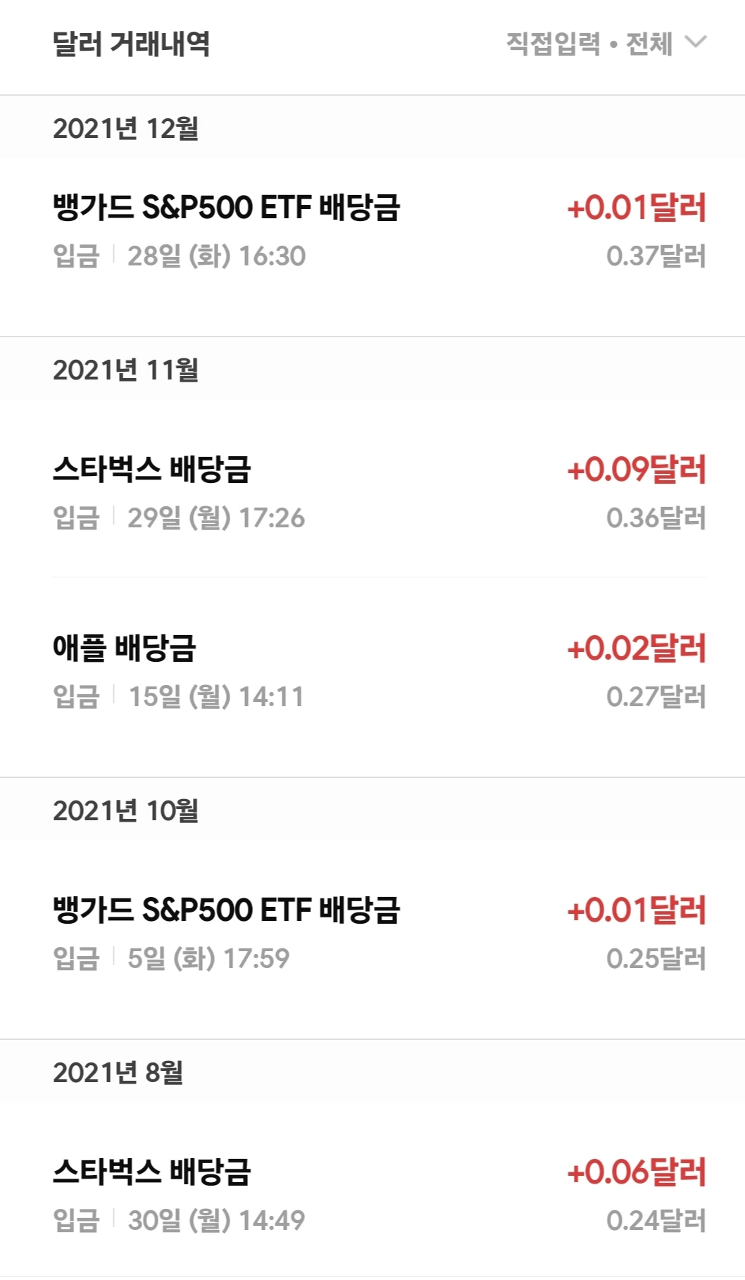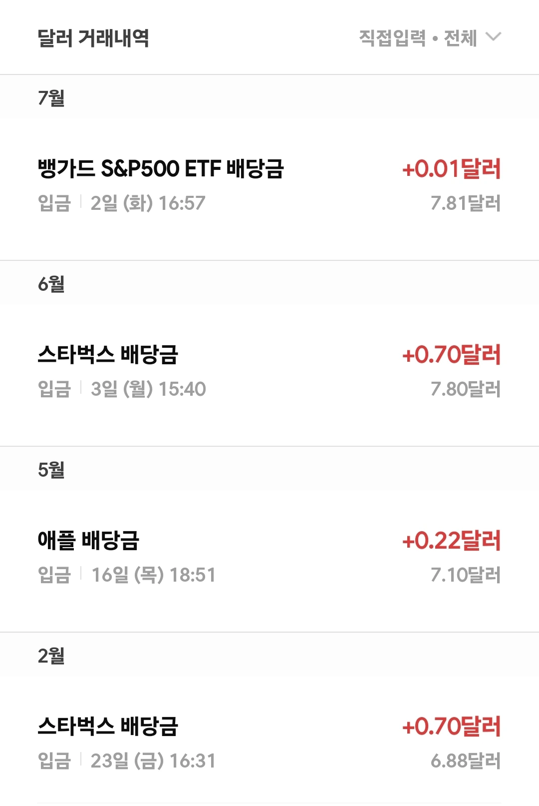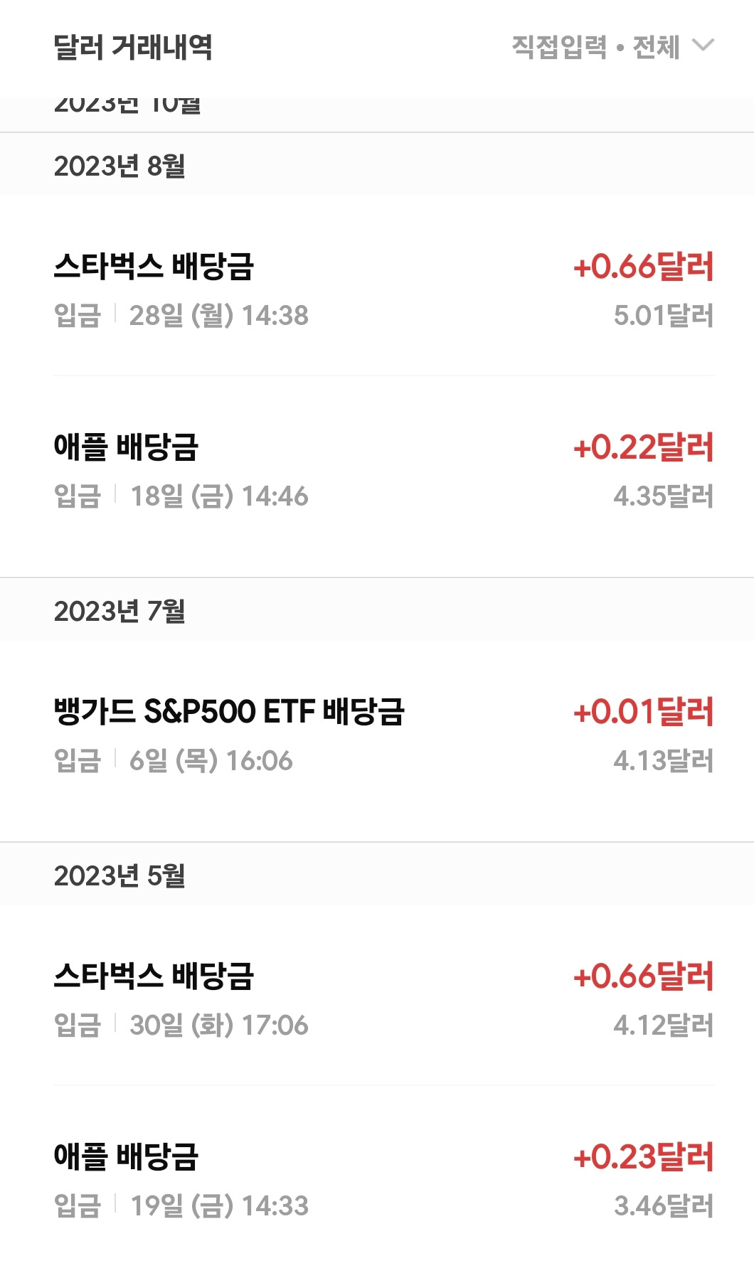 주린이었지만 코로나 때 유튜브 광고로 미니스탁을 알게 되고 소수점 투자를 했다. 미국 지수에 투자하고 싶었지만 방법을 몰랐다. 그것 대신 남편이 즐겨 마시는 스타벅스, 이름이 친숙한 애플, 나이키, 아마존, 테슬라 같은 우량주를 매수했다. 테슬라와 나이키는 마이너스였지만 워낙 적은 금액이라 방치하고 애플, 스타벅스는 3개월 동안 매주 1만 원씩 매수해서 귀엽게도 1주 이상을 모았다. 종종 배당금 알림톡을 보며 어디에 그게 쌓이는지도 모르고 그냥 좋았다. 배당금을 재투자할 생각도, 배당성장주를 더 매수할 생각도 못했다.
