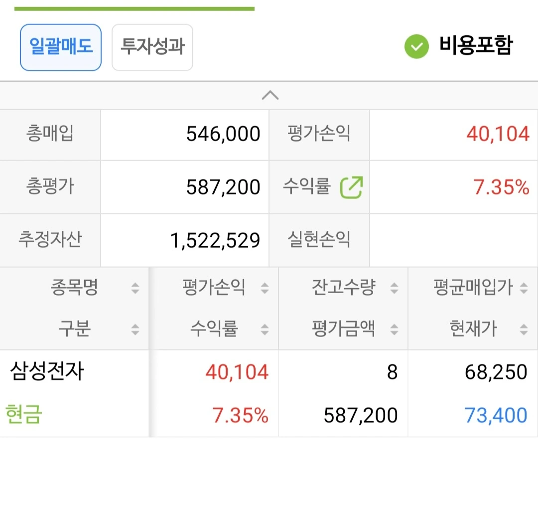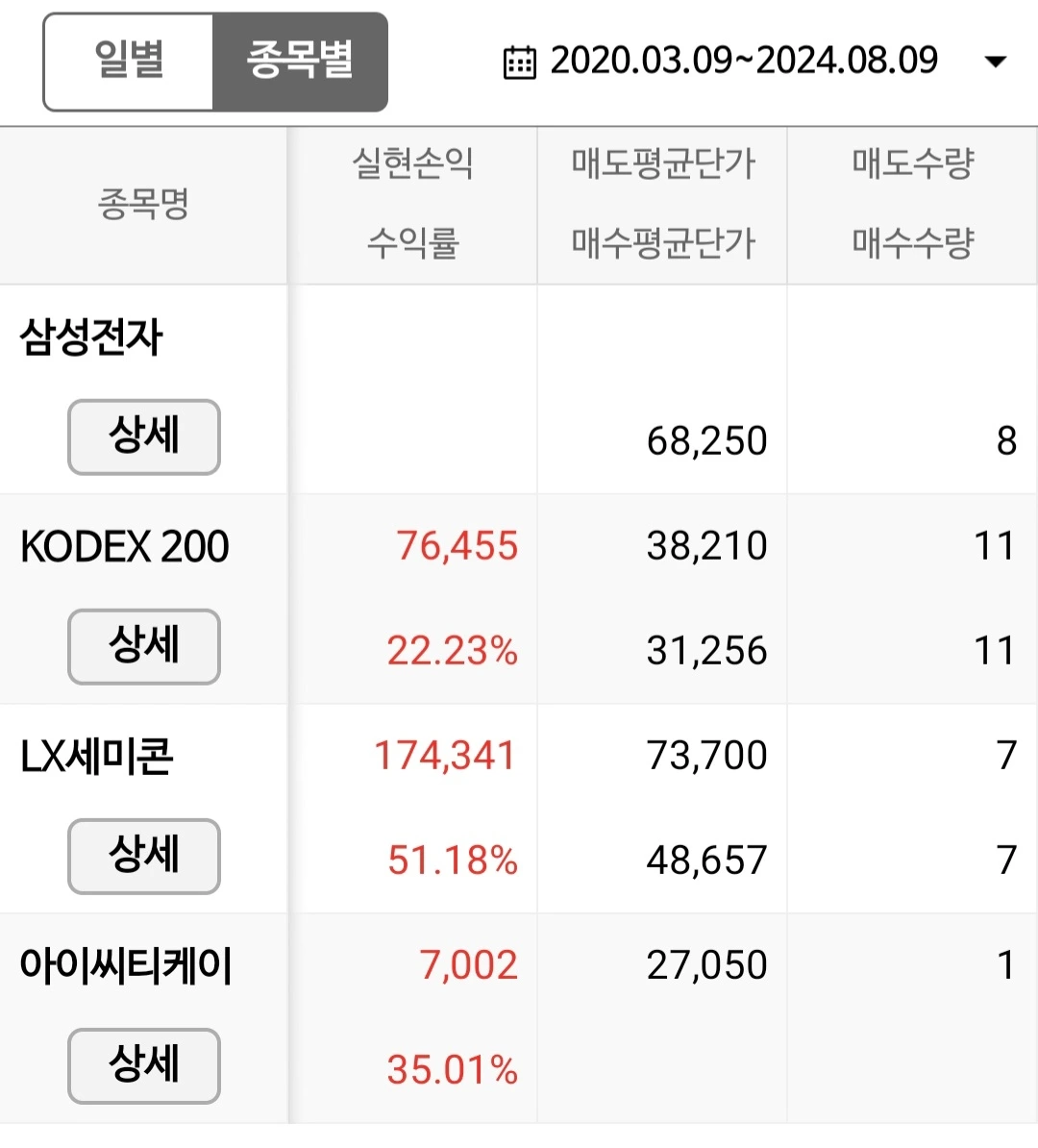 그렇다. 주린이는 주식 매수하는 방법조차 알지 못했고, 혼자서는 어떤 주식을 매수할 용기도 없었다. 그렇기 때문에 그 실습은 나에게 아주 중요한 의미가 있었다. 이후 남편이 추천해 주는 종목을 매수했고, KODEX200도 매수했다. 수익률이 좋을 땐 60~70% 수익이 난 종목도 있었는데 현재(24.8.9) 수익률은 많이 떨어진 상황이다. 하지만 저가일 때 매수한 덕분에 전체적으로는 플러스다.