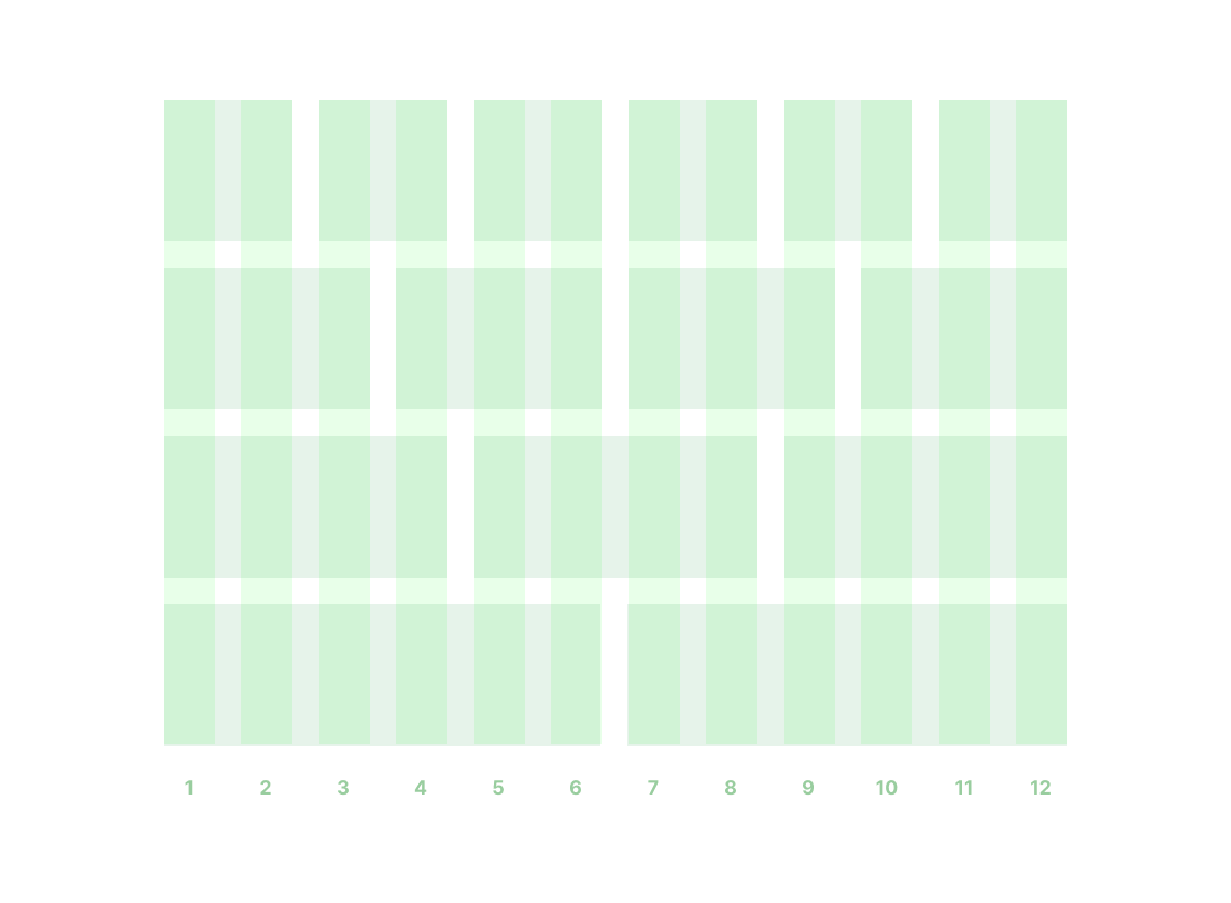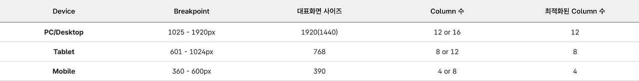 desktop → 12~16개 = 보통 12를 쓰는데 이유는 2, 3, 4, 6의 배수이기에 다양한 조합을 만들 수 있기 때문이다. (Material Design, Bootstrap)