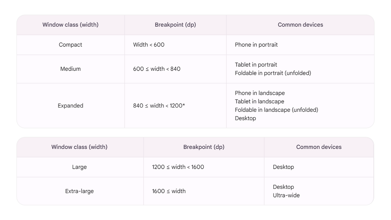 공통적으로 모바일은 600px이하이며 태블릿과 데스크톱은 미묘한 차이를 가진다. 모바일과 태블릿의 경계가 600인 이유는 소형 태블릿 사이즈가 7인치인데 그게 600px이기 때문이라 판단한다. PC와 태블릿의 경계는 모호하다. 1200을 나누기도 하며 1024로 나누기도 한다. 선택 기준은 자사 서비스를 기준을 나누거나 그것도 없다면 가장 많이 사용하는 기종을 기준을 나누면 된다. 가장 작은 태블릿인 7인치가 600x1024이니 아무래도 1024에서 1차적으로 끊는 게 좋아 보인다. 기종 별 스크린 사이즈 참고