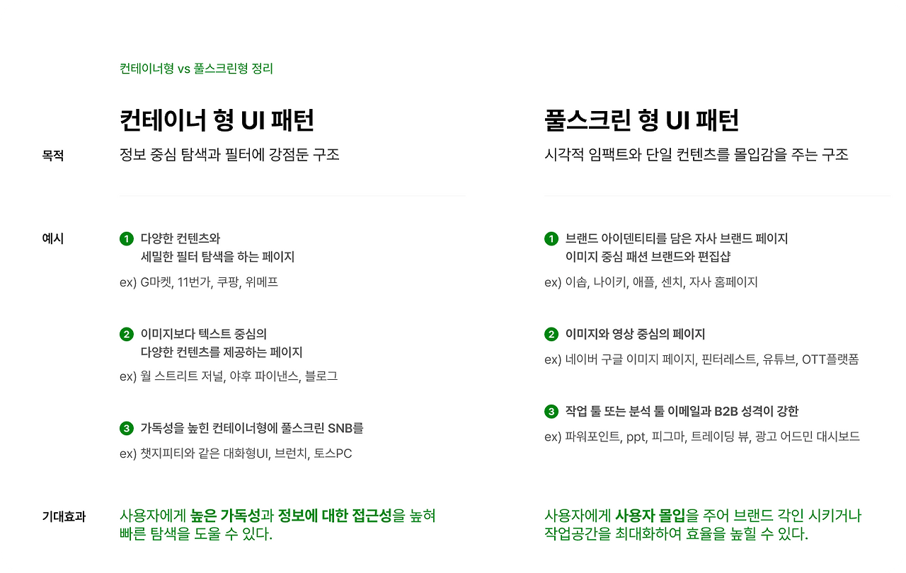 쇼핑몰에서 기준을 굳이 나누자면 종합 쇼핑몰과 브랜드 쇼핑몰의 차이로 볼 수 있겠다. 하지만 정답은 없으며 목적에 맞는 UI를 차용하면 되는 것이다. 풀스크린은 브랜드 아이덴티티와 단일 콘텐츠에 강점을 가지고 컨테이너형은 다중 콘텐츠 탐색과 필터에 강점을 가진다. 같은 쇼핑몰이지만 다른 레이아웃을 가지는 게 흥미로운 점이다.
