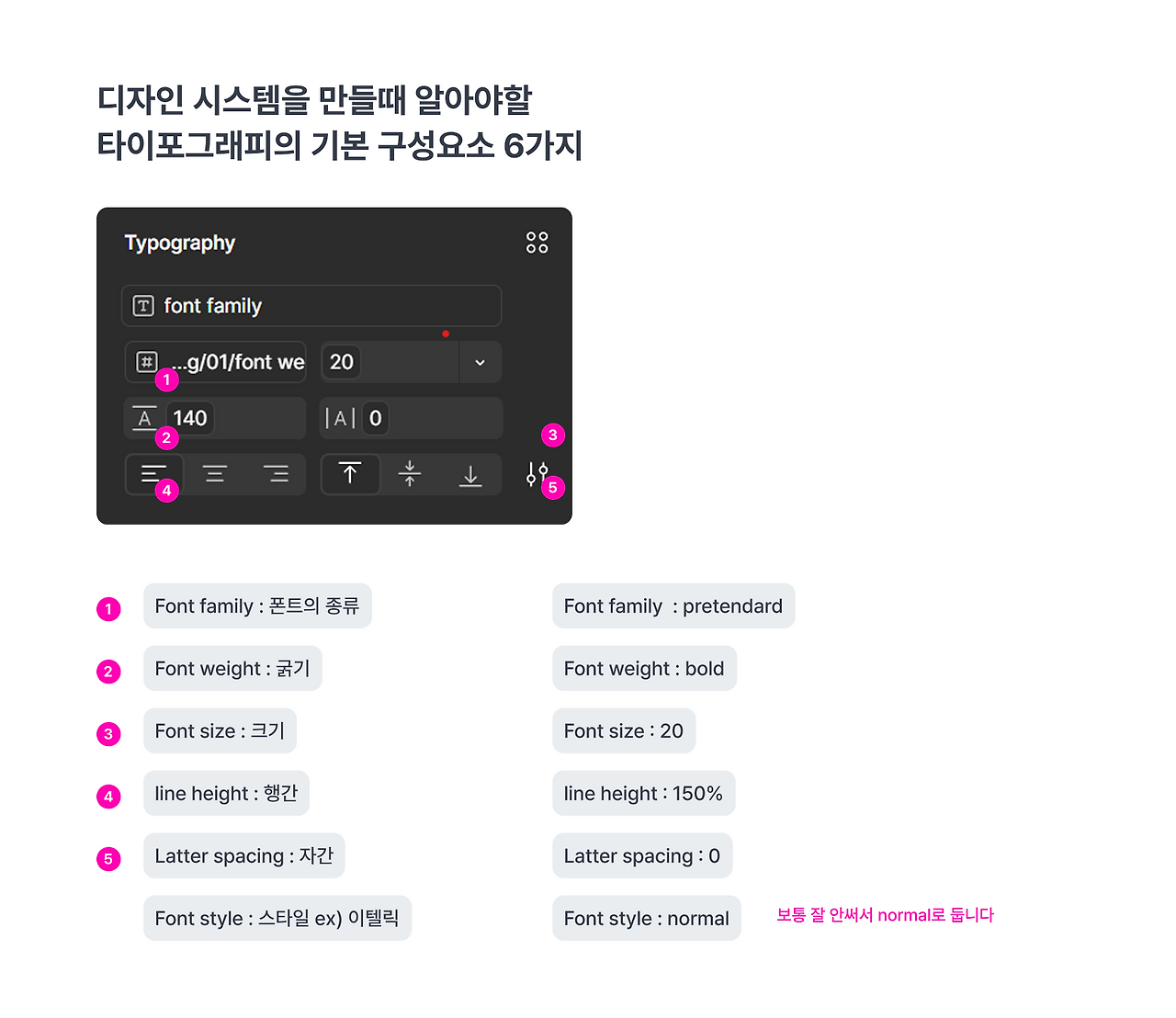 타이포그래피(Typography)는 정보를 효과적으로 전달하고 일관된 경험을 제공하는 핵심 요소입니다. 타이포그래피의 구성 요소는 ① 폰트 패밀리, ② 스타일, ③ 굵기, ④ 크기, ⑤ 행간, ⑥ 자간으로 나눌 수 있습니다. 이 요소들을 적절히 조합하면 텍스트의 가독성을 높이고, 위계를 명확히 하며, 사용자가 빠르게 정보를 인식하도록 도울 수 있습니다.