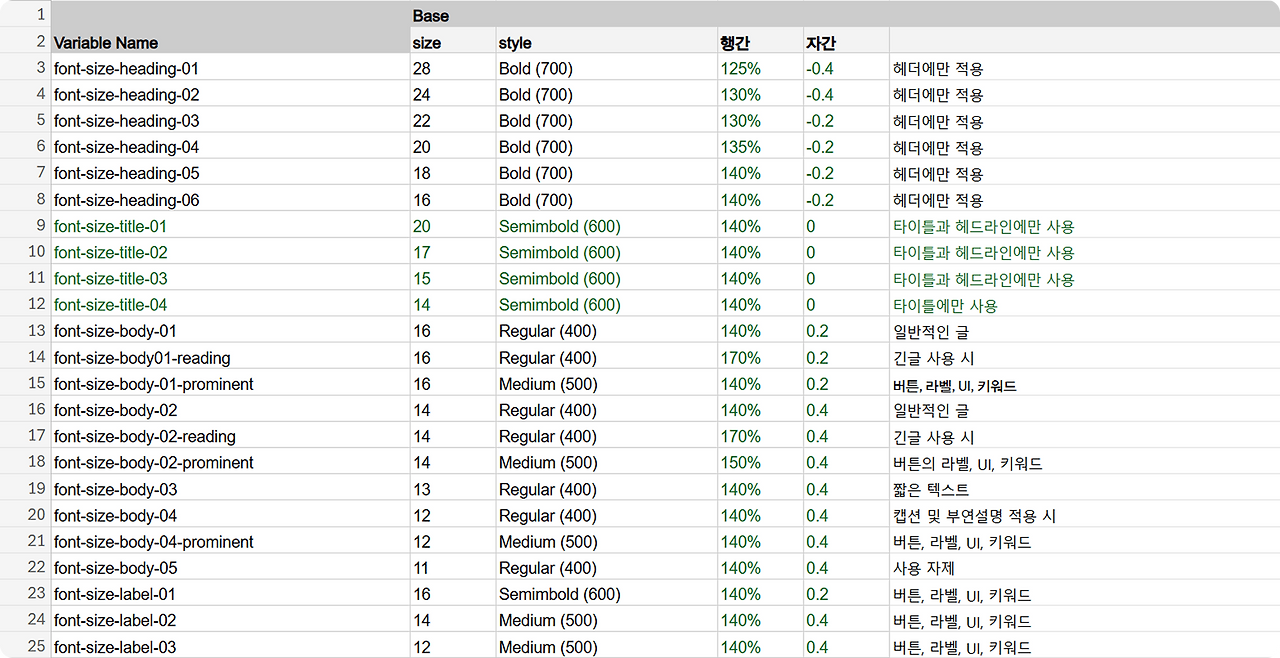 마지막으로 스타일 네이밍도 정리했습니다. 예를 들어, 기존에는 body 01 이 숫자가 클수록 중요했고, 반대로 heading 01 은 숫자가 작을수록 큰 제목을 의미했어요. 이처럼 기준이 일관되지 않았던 부분도 전면 수정했습니다.
