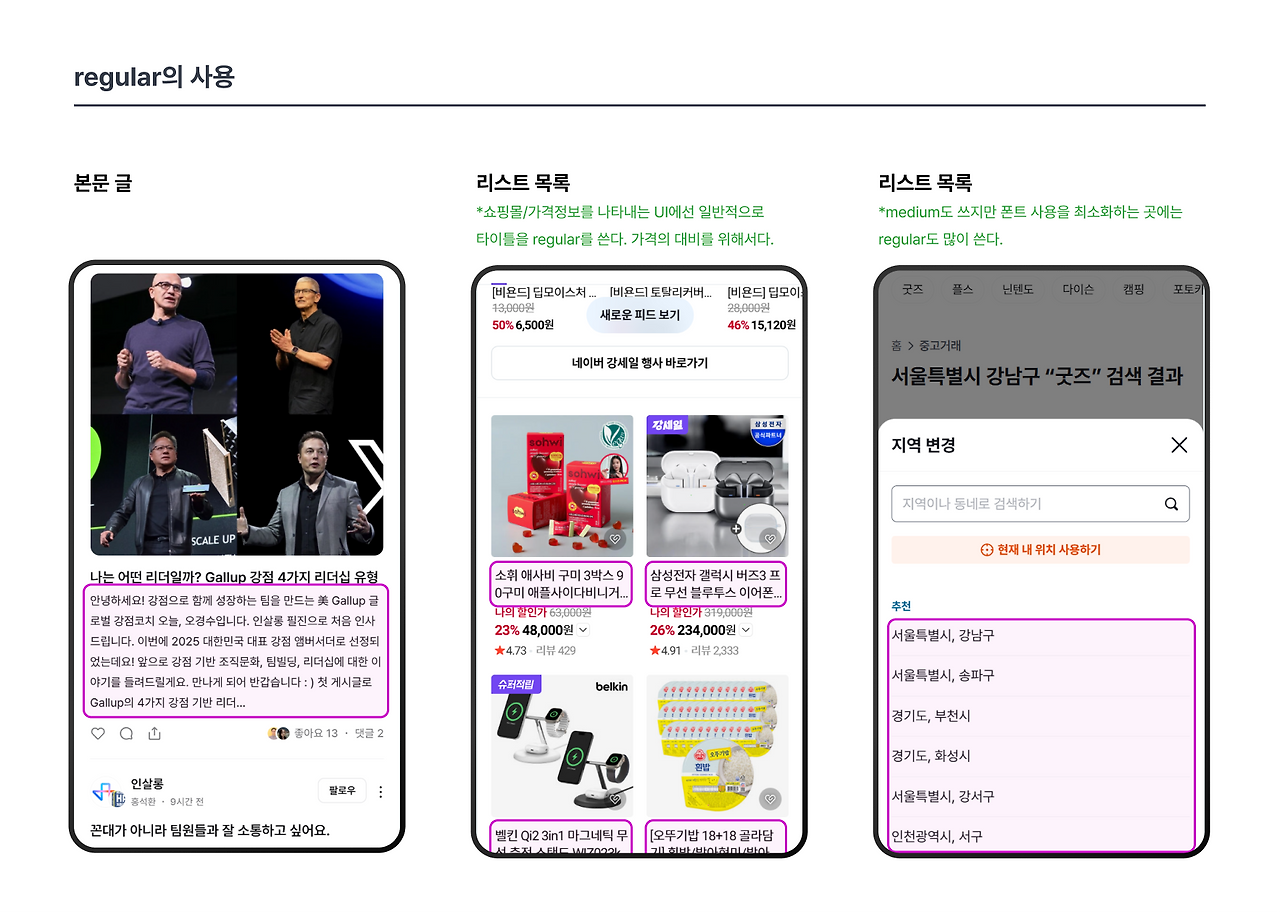 타이포그래피의 수준에 따라 사용자 경험이 달라집니다. 예를 들어, 반복되는 피드에서 타이틀을 Bold체로 설정하면 시각적 피로도가 높아집니다. 특히 모바일에서는 짧은 시간 내에 많은 정보를 소비해야 하기 때문에, 가독성이 더 중요한 요소가 됩니다. 글을 읽어야하는 커뮤니티, 뉴스와 같은 가독성이 중요한 플랫폼들을 돌아보세요. bold체를 남용하지 않습니다. 짧은 제목, 키워드, 숫자에 씁니다.