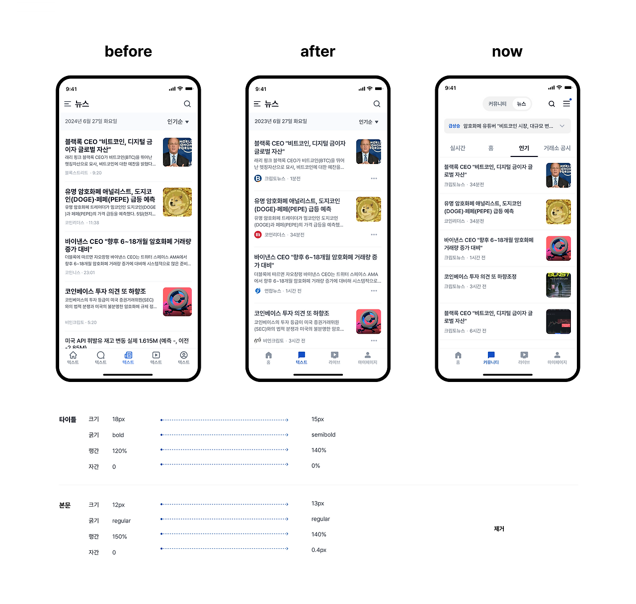 정보성 글 중 뉴스는 세부내용까지 노출시키지 않습니다. 제목이 중요하죠. 제목에 어그로를 끕니다. 그래서 뉴스 프로필 이미지를 제거하고, 바디카피를 제거하고 제목만 노출해도 됩니다. 빠르게 정보를 탐색하는데 바디 텍스트는 방해됩니다. 복잡함에서 간결함으로 바뀌었습니다. 타이포그래피는 위계질서와 정리는 기본입니다. 그래서 중요합니다.