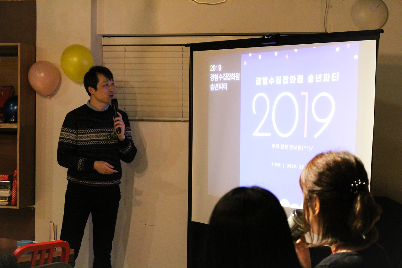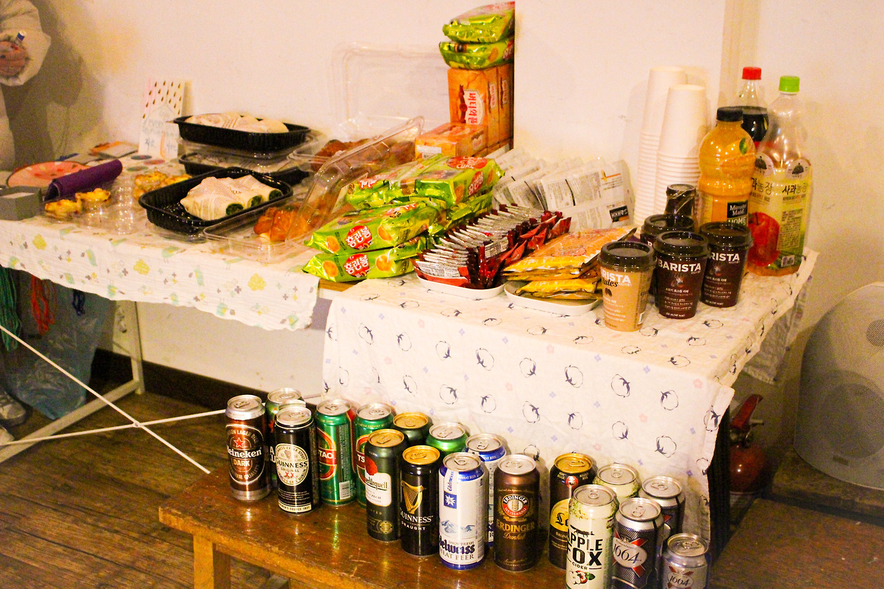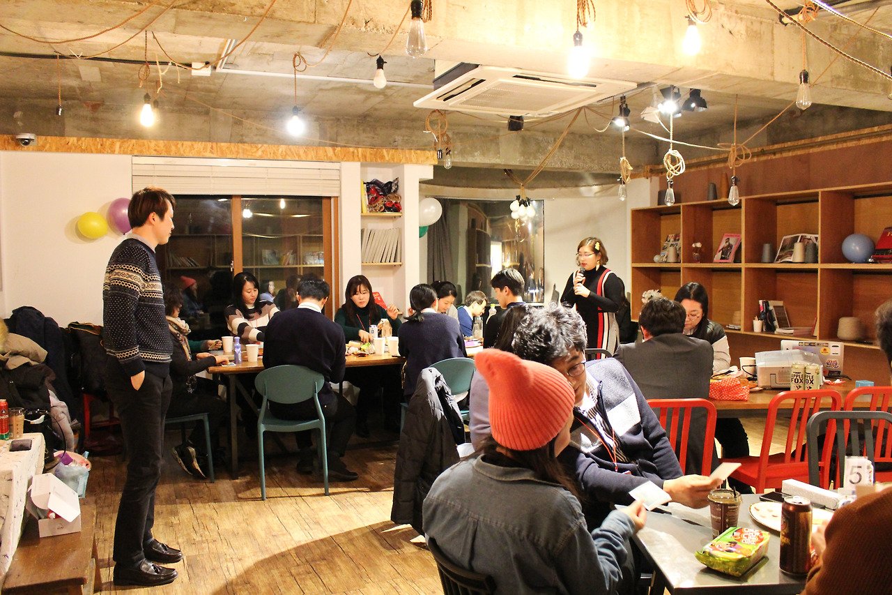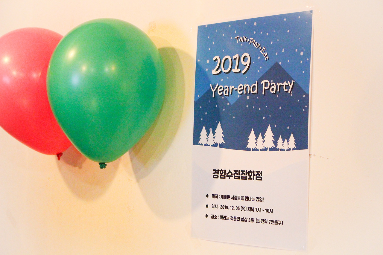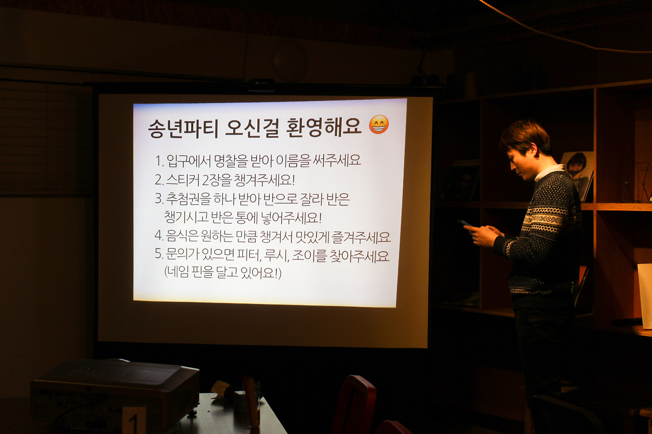 논현동 대관한 장소에 미리 도착한 우리는 부랴부랴 송년파티 준비를 진행했다. 할 일은 많은데 생각보다 시간이 많이 걸렸다. 일찍 도착한 까미엄마님과 하노마님이 있었기에 피터와 함께 맥주 및 음료를 제시간에 사 올 수 있었다. 역시 함께 준비하면 퀄리티가 높아지는 걸까. 조이의 철저한 준비 덕분에 파티 분위기가 물씬 풍겼다.