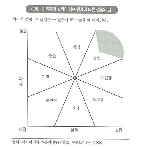 완전히 빠져드는 경험을 할 수도 있다. 이러한 순간의 공통점은 의식이 경험으로 꽉 차 있다는 것이다. 이때 각각의 경험은 서로 조화를 이룬다. 일상 생활에서는 좀처럼 그런 경험을 맛보기가 어렵지만 그 순간에는 느끼는 것, 바라는 것, 생각하는 것이 하나로 어우러진다.