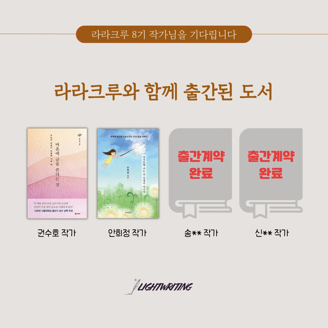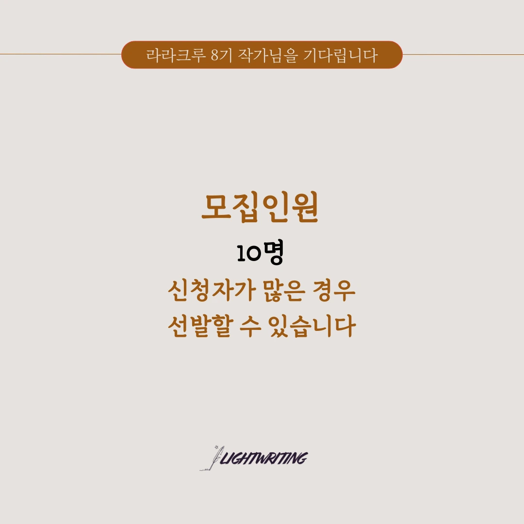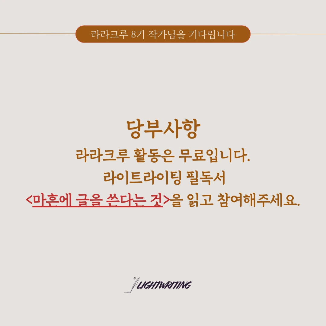 <라이트라이팅: 라라크루>에서 지금 8기 작가님을 모집합니다.^^