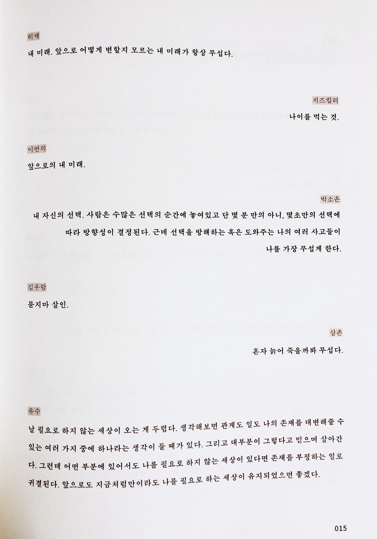 정면을 뜻하는 Facade 라는 단어를 제목으로 갖고 있는 이 책은 공포의 이면을 향하고 있다. 독립출판물에 흥미를 못 느끼던 내게 이 책은 강렬한 충격과 신선함을 선사한다. 도발적인 책표지와 훅(hook)적인 질문.