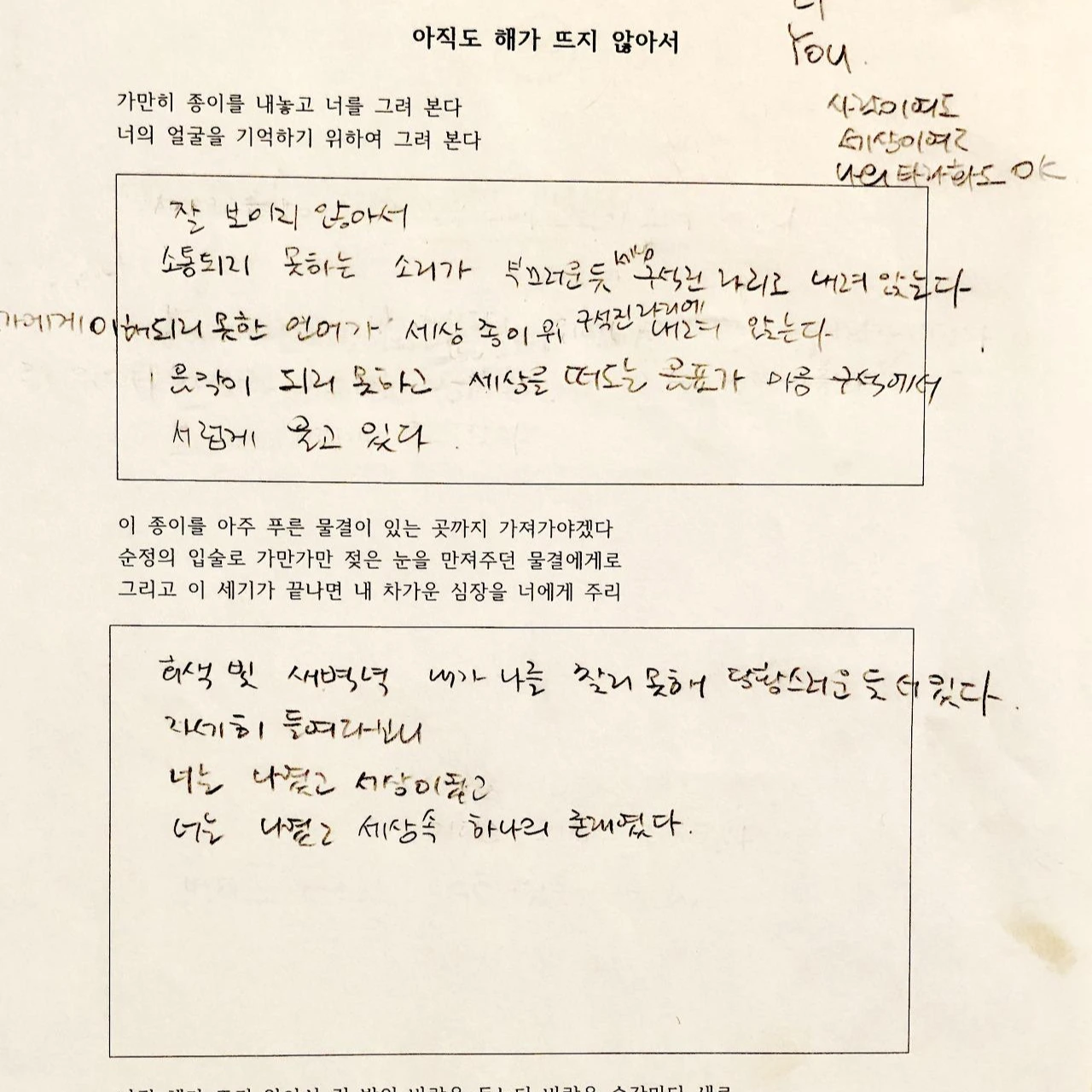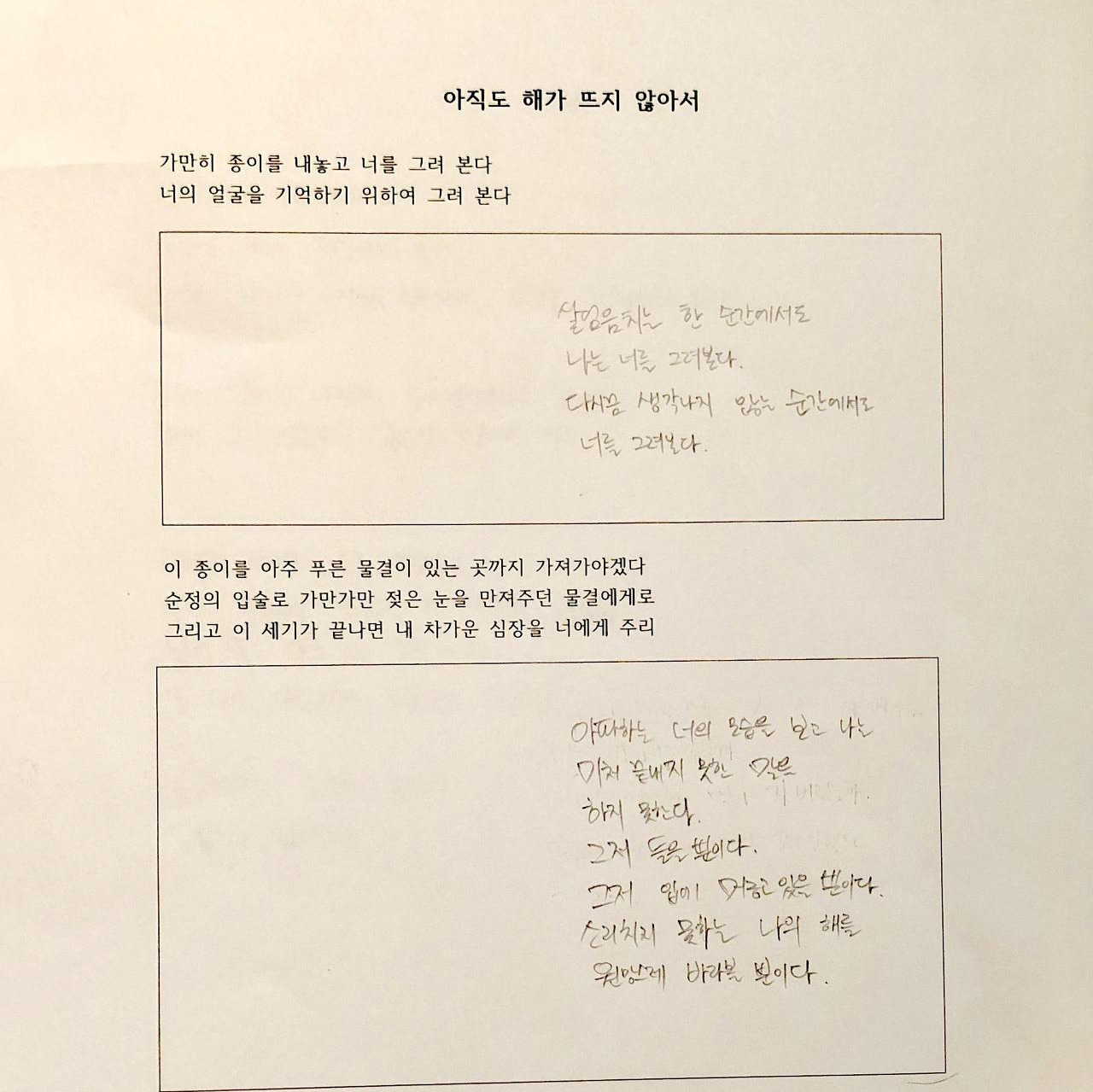 태어나지 못한 음악은 “너는 나였고, 세상 속 하나의 존재”로, “소리치지 못하는 나의 해”를 원망스럽게 바라보는 존재로 태어났습니다. 아직 해가 뜨지 않은 그 날의 서사가 각자의 이야기와 만나 사랑의 시가 되고, 자신의 숨은 자아에게 말을 건네기도 합니다. 시를 이해해보는 것만으로 끝나는 것이 아니라 시를 직접 써보고, 시인의 말에 자신의 이야기를 덧붙여 보면서 각자의 자기가 직면해있는 문제의 근본에 조금씩 다가갔습니다. 시를 읽고 이해하고 시인의 세계를 경험해보는 것도 좋은 체험이지만 그 시를 통해 자신이 몰랐던, 모른척했던, 불편했던 무언가에 닿는 경험을 만드는 것도 문학을 읽고 이해하는 것만큼 중요합니다. 이런 이유가 문학힐러를 가능하게 하는 힘이기 때문입니다.