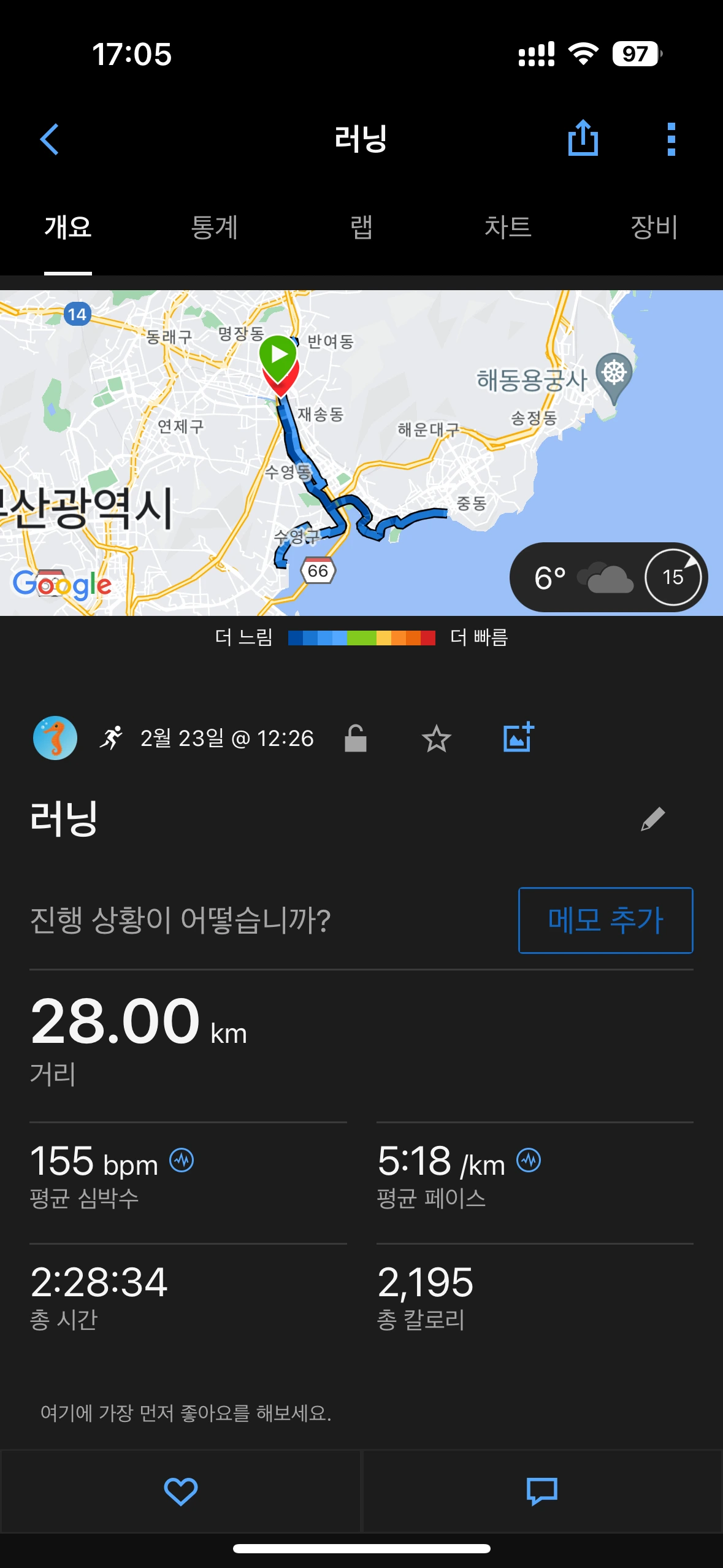 총 28km를 달렸고, 평균 페이스는 5분 18초였다.