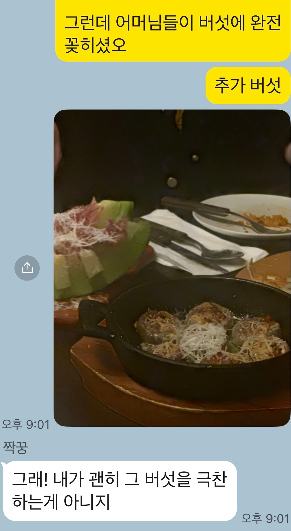 이집 남편분이 같이들 드시라고 와인을 챙겨보내주셨다. 부부가 데이트도 자주 하고 우리들 술자리에 종종 나타나 계산하신 뒤 아내를 에스코트해 귀가하시곤 하던 분이다. 넷이 와인 두병은 조금 모자랐고 버섯안주로만은 부족했다. 멤버가 다르니 당연한 것이다. 하지만 이들 역시 버섯을 최고로 여겨 버섯 추가주문을 하기 시작했다.